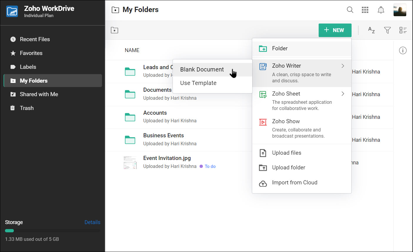 2021年8月6日以降、すべての新規登録はWriter、Sheet、表示に自動的にWorkDriveの個人プランが適用され、これらのアプリで作成したファイルはWorkDriveに保存されます。