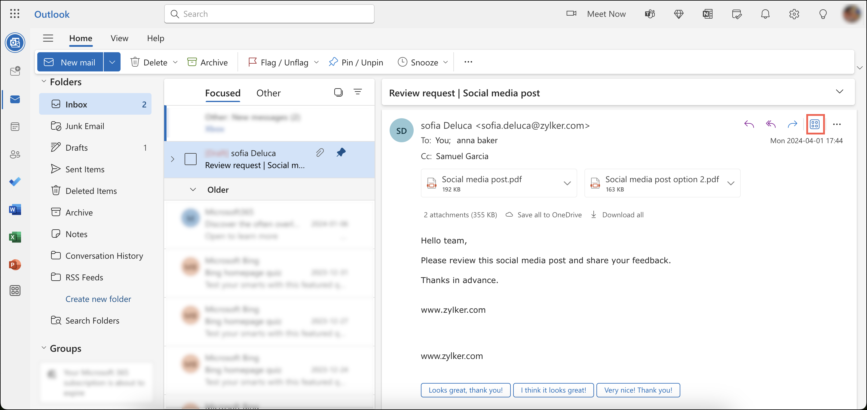 現在、Zoho WorkDrive 追加する-in for Microsoft Outlook は Outlook モバイルアプリケーションには対応していません。