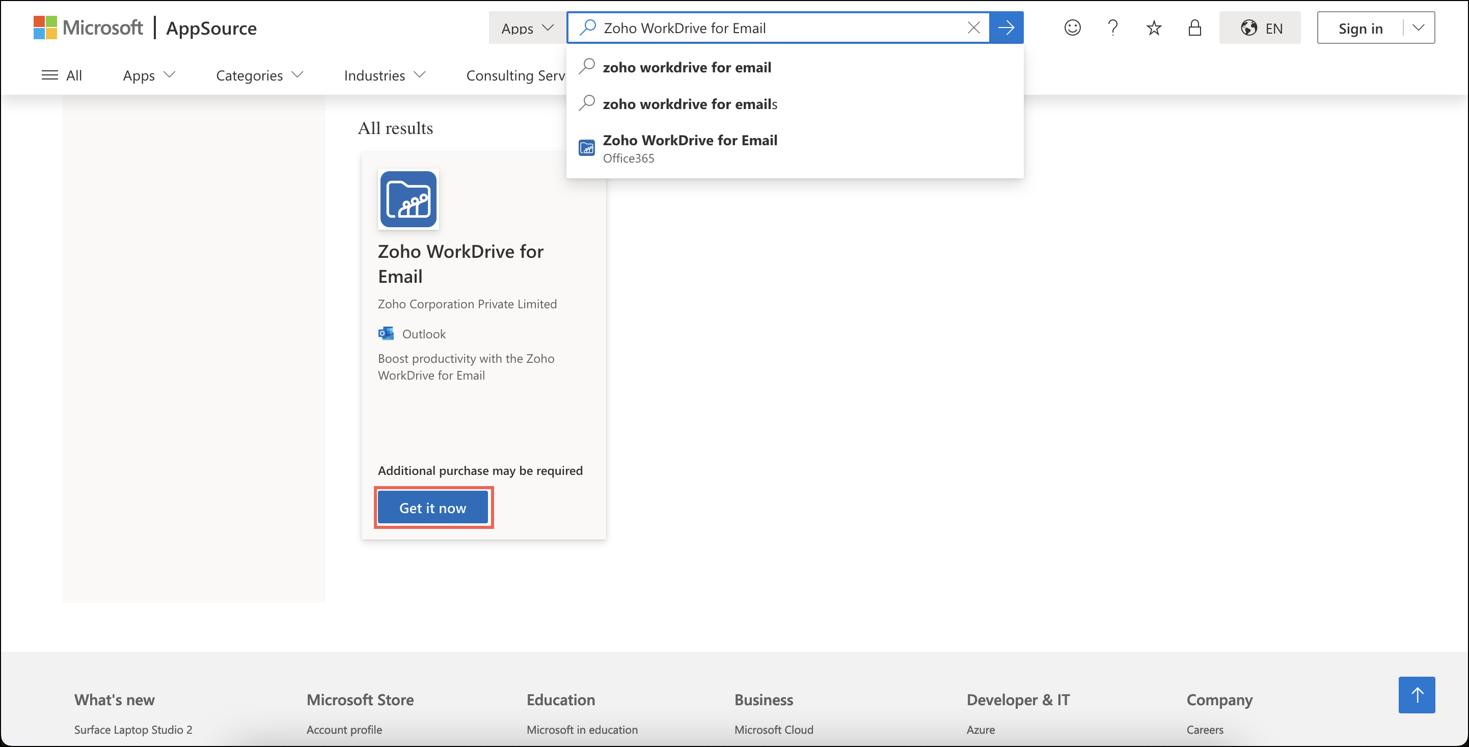 3. 検索結果からZoho WorkDrive for メールを見つけ、取得する it nowボタンをクリックします。