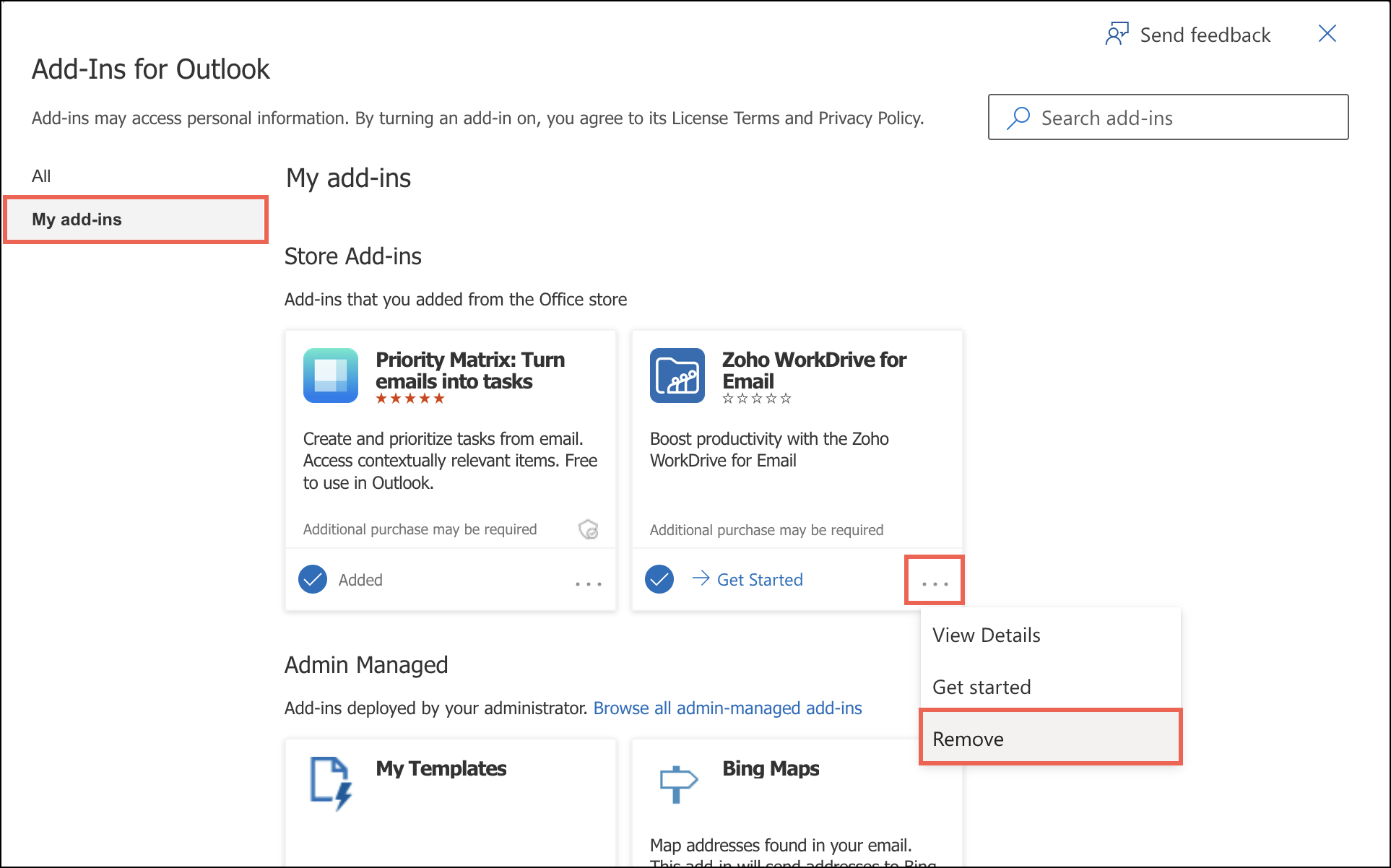 Zoho WorkDrive for Outlook 追加する-in のアンインストール