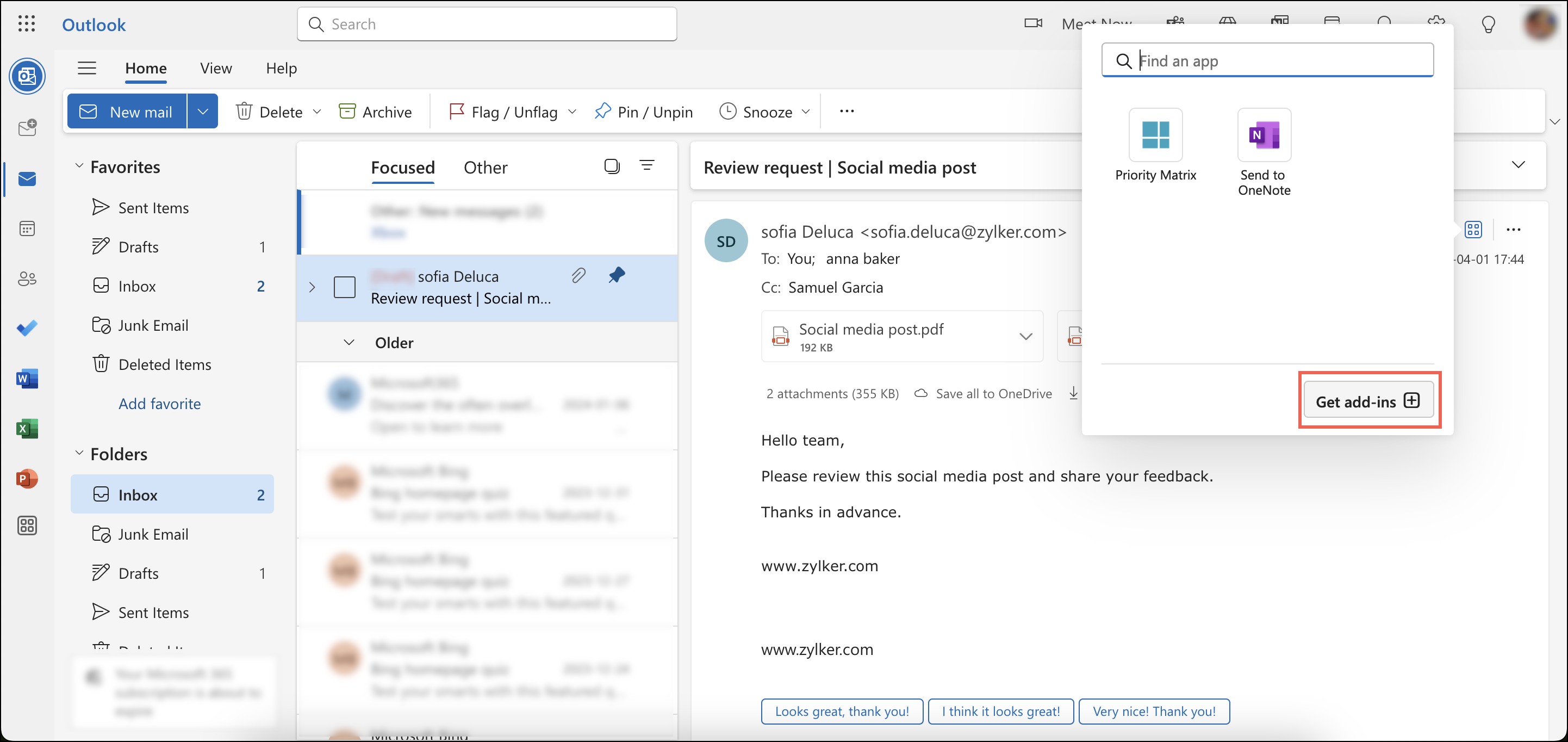 2. 任意のメールを選択し、メール上部の追加する-ins を取得するアイコンをクリックします。これにより、Outlook の追加する-ins一覧にリダイレクトされます。