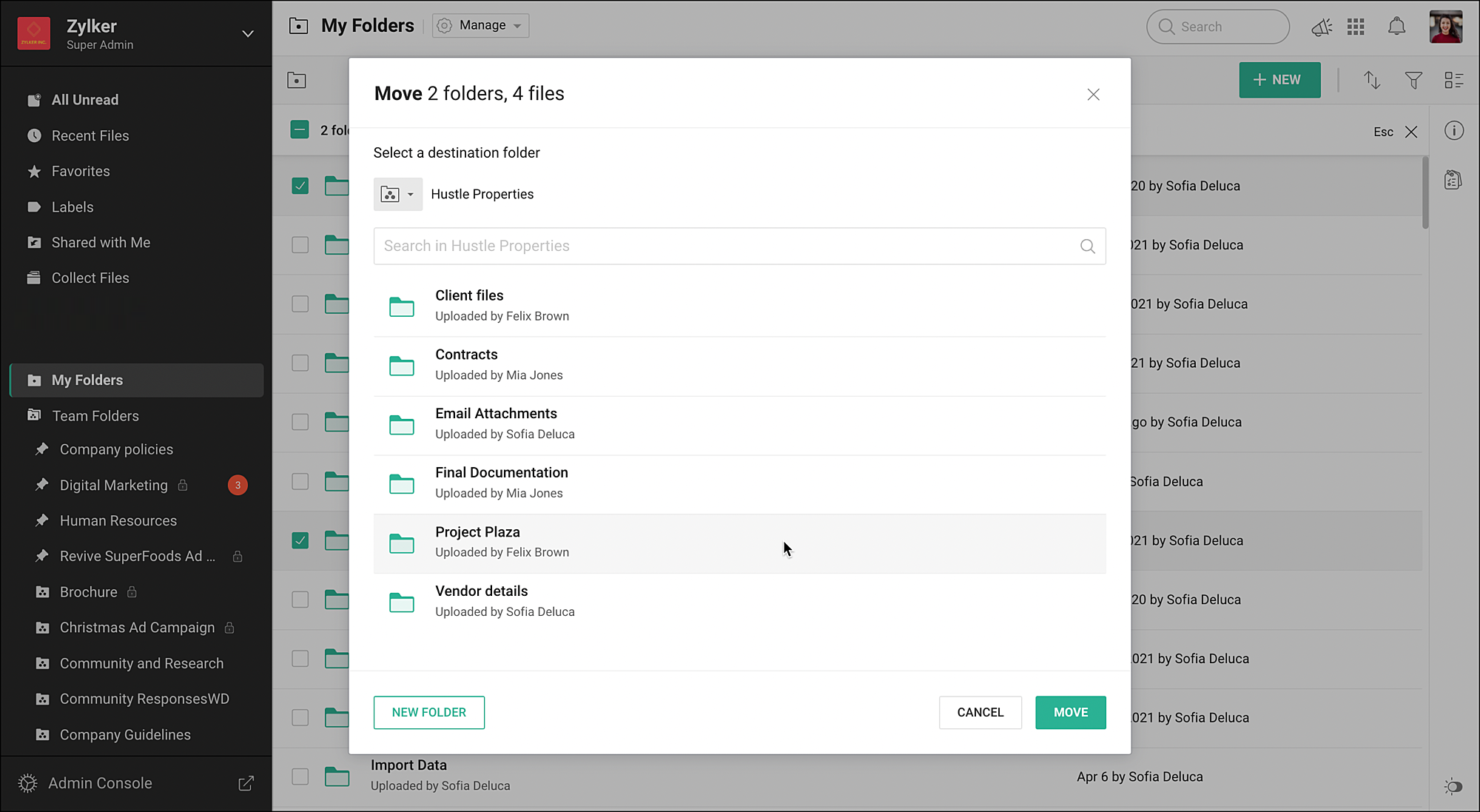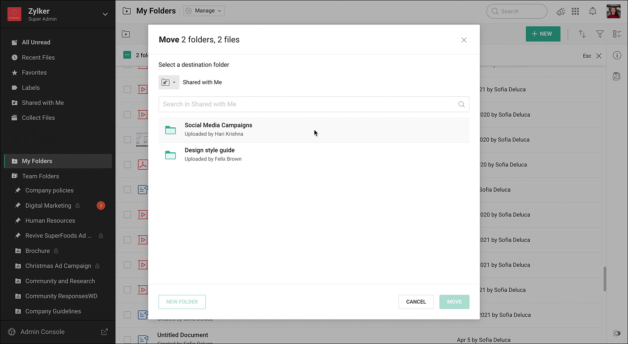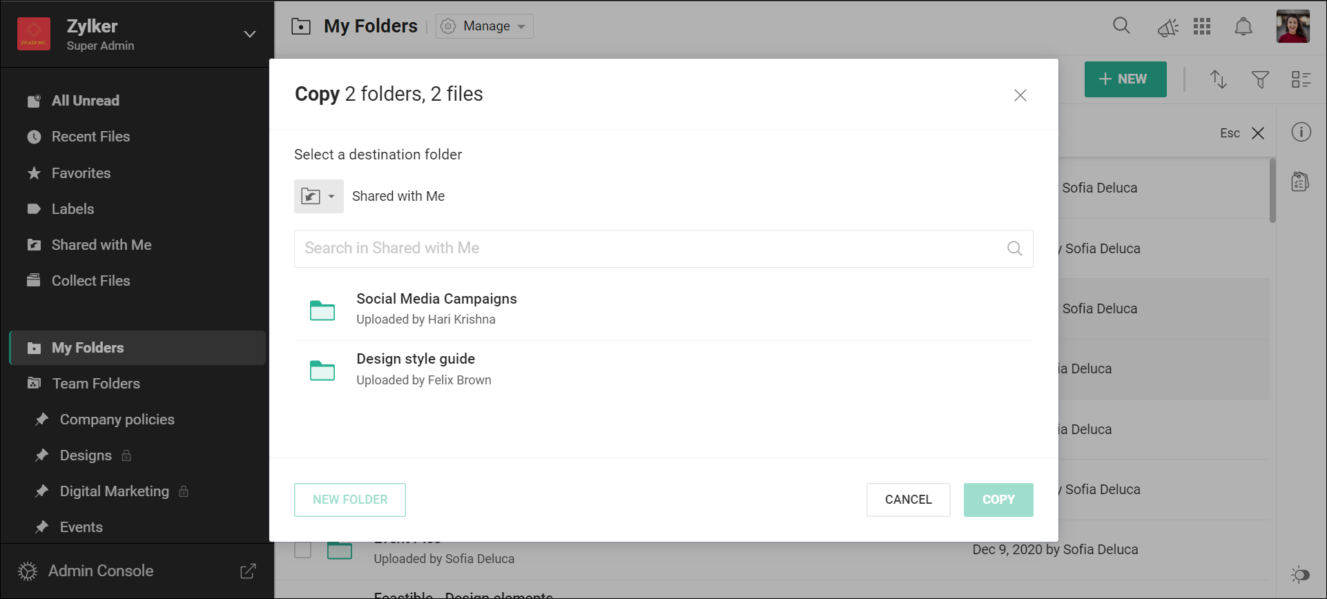 Zoho WorkDriveのMy フォルダーは、非公開スペースであり、ファイルの作成、保存、同僚との共有が可能です。