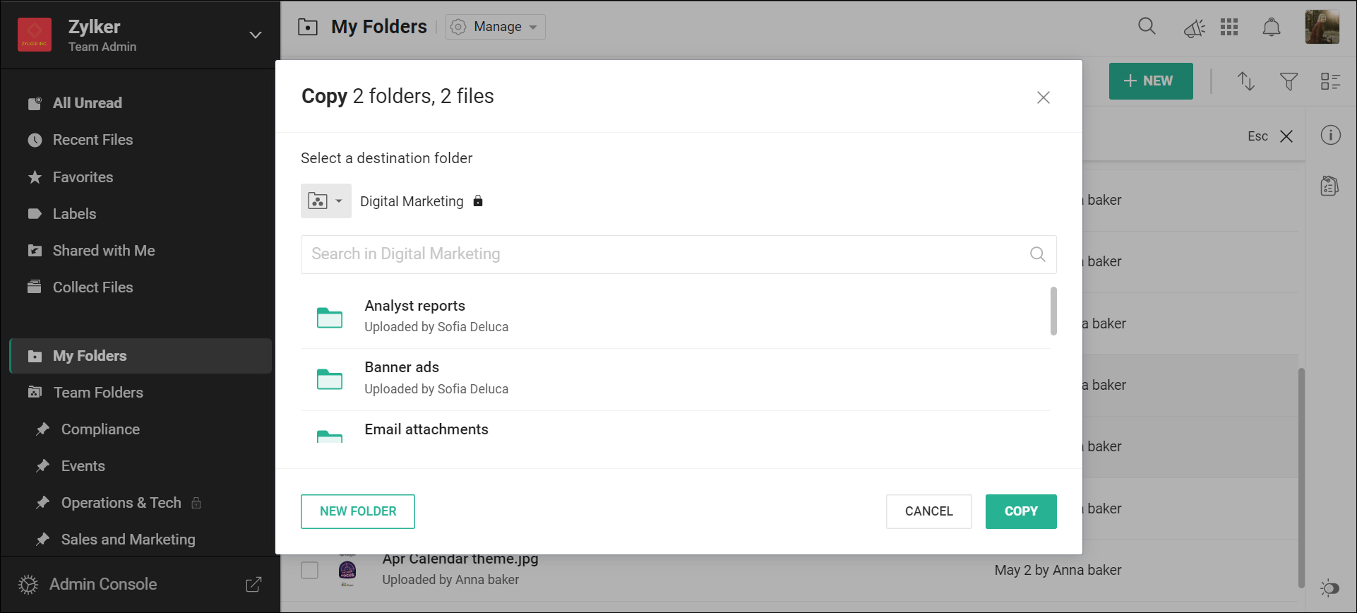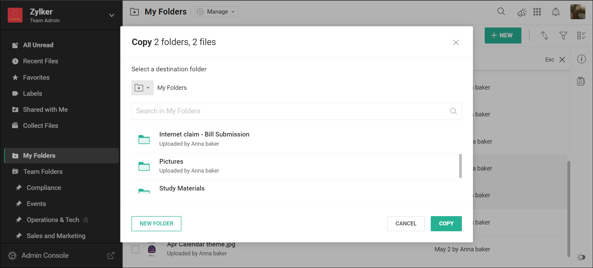 My フォルダーからTeam Folderへファイルやフォルダーをコピーするには、そのTeam Folderで少なくともEditor役割が必要です。