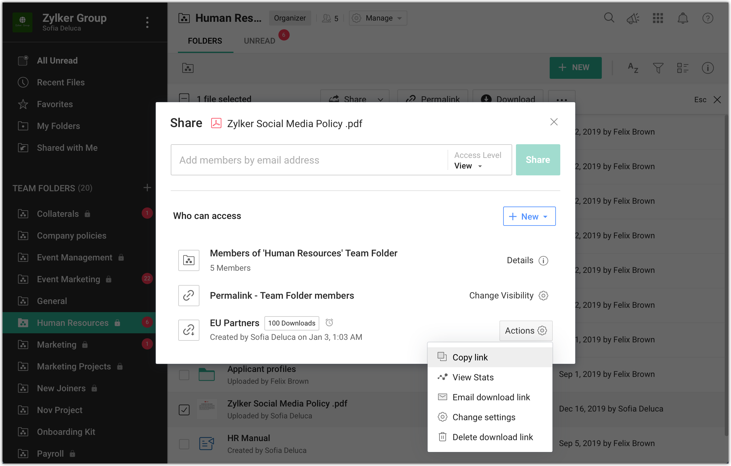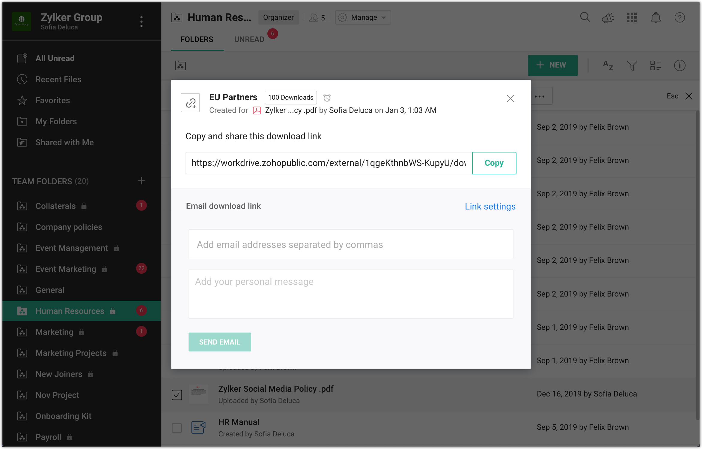 チームフォルダまたはマイフォルダに保存されているファイルやフォルダのダウンロードリンクを簡単に作成し、チームメンバーや外部ユーザーと共有することができます。各ダウンロードリンクには、ダウンロード制限や有効期限を設定することもできます。また、同じファイルやフォルダに対して複数のカスタムダウンロードリンクを作成し、異なるユーザーグループと共有することもできます。