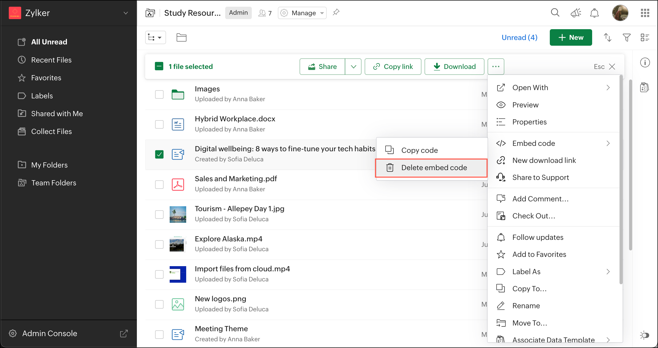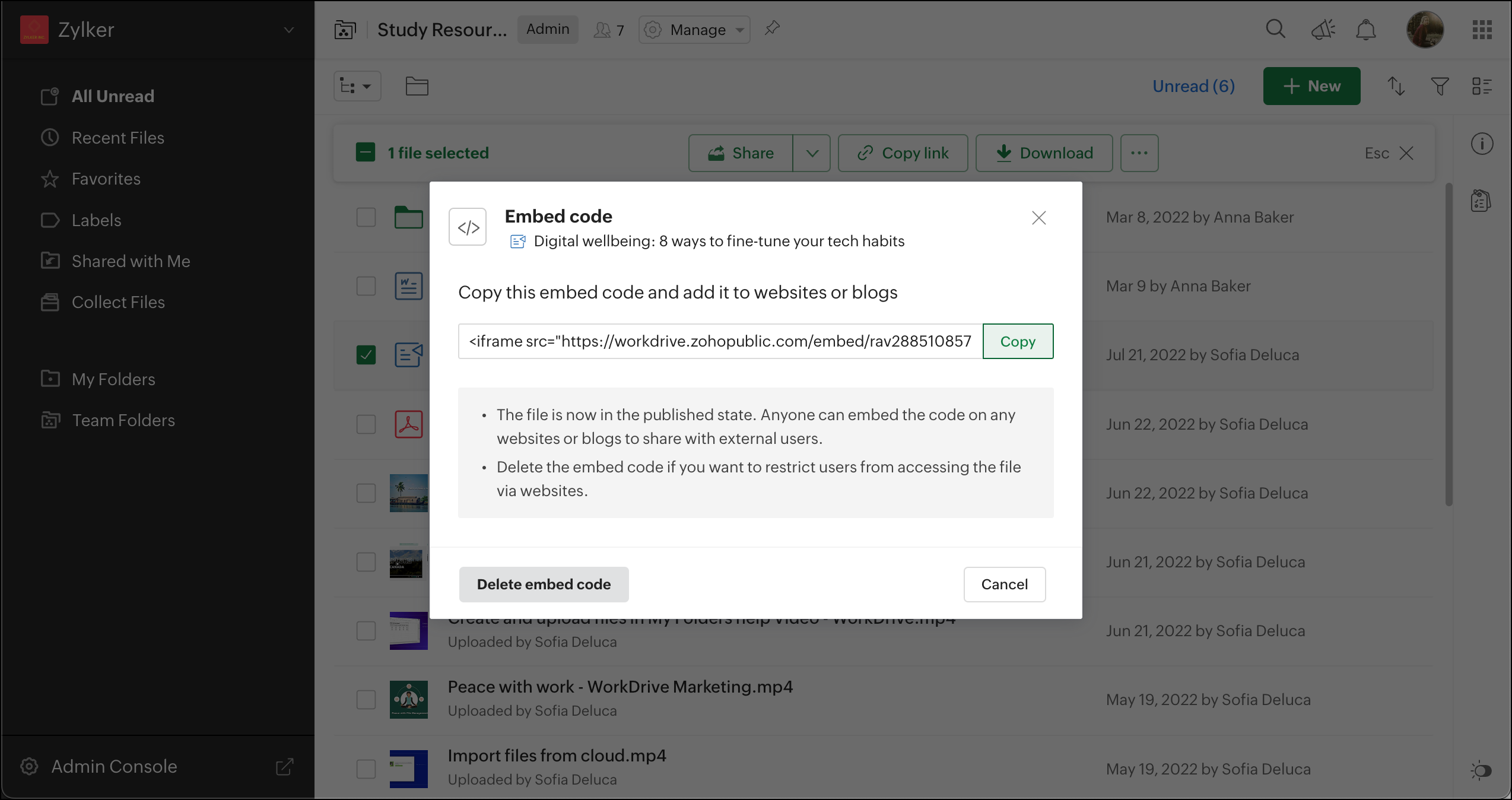 4. WorkDriveでは、埋め込まれたファイルやフォルダのアクセス統計情報はまだサポートされていません。
