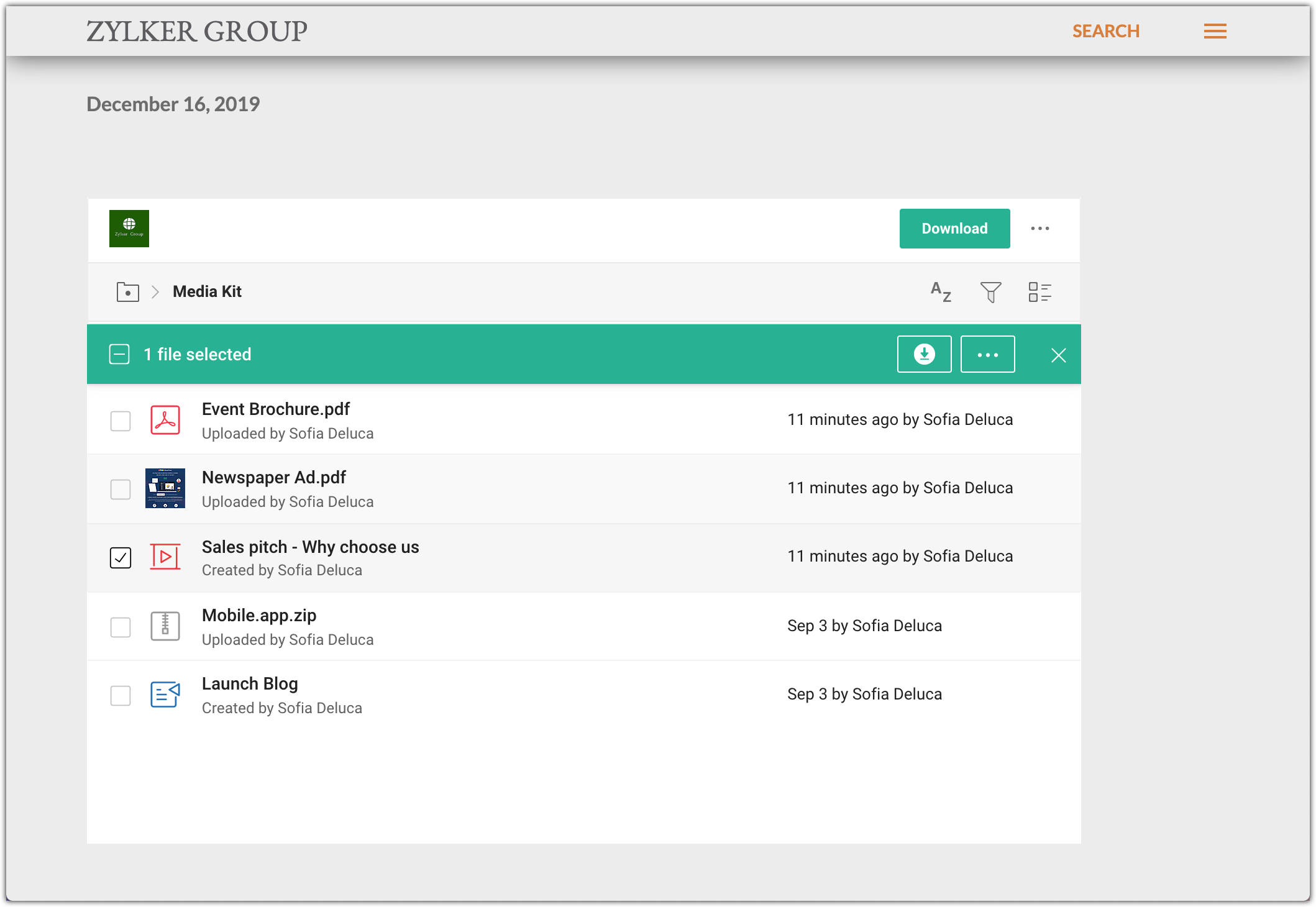 チームフォルダまたはマイフォルダに保存されているファイルやフォルダの埋め込みコードを簡単に作成し、ウェブサイトやブログに追加することができます。外部ユーザーはウェブサイトやブログから埋め込まれたファイルやフォルダを閲覧ダウンロード、および印刷することができます。