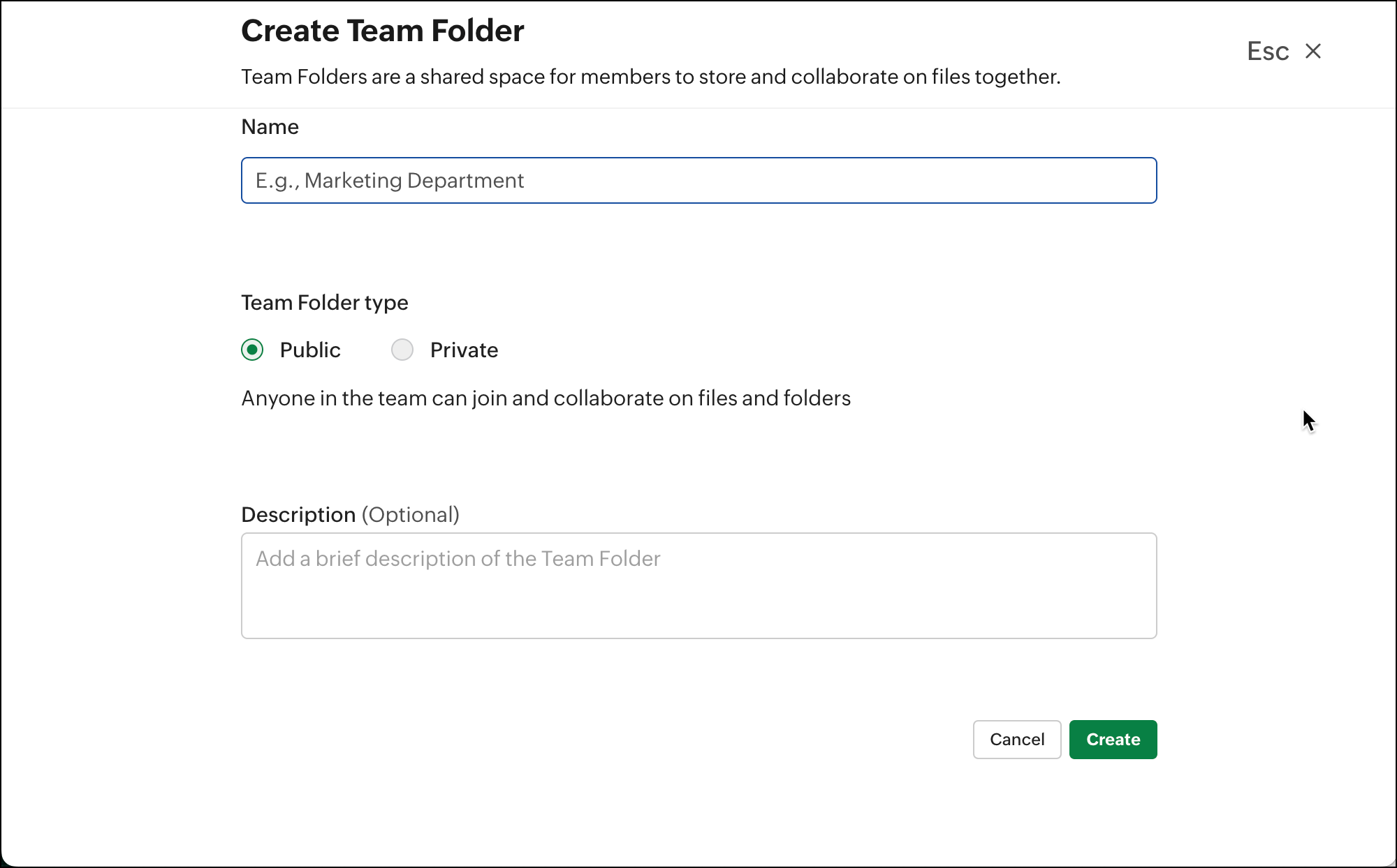 2. Team フォルダーの名前を入力し、作成したい Team フォルダーの種類を選択します。公開 Team フォルダーまたは非公開 Team フォルダーのいずれかを選択できます。