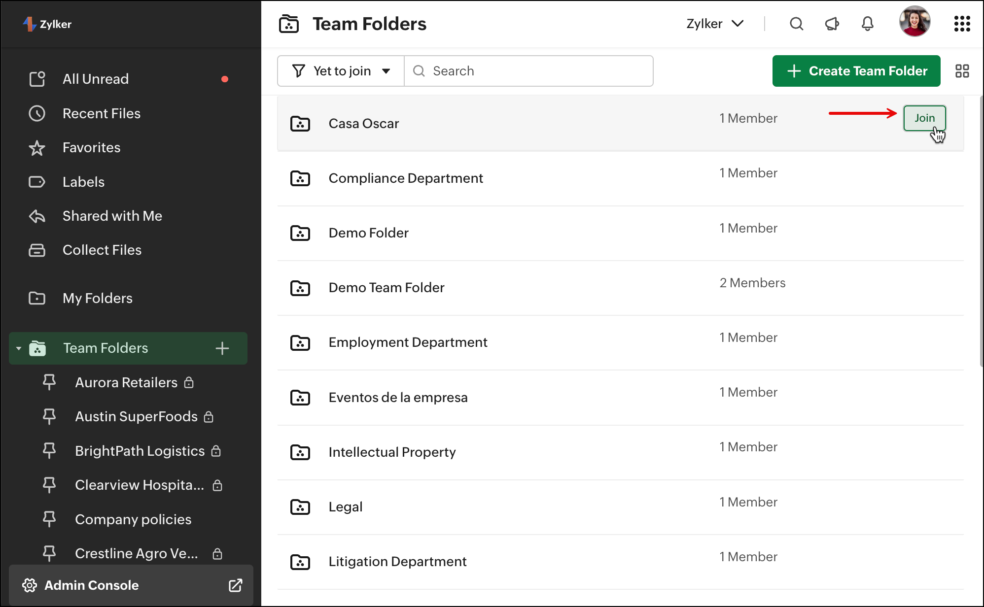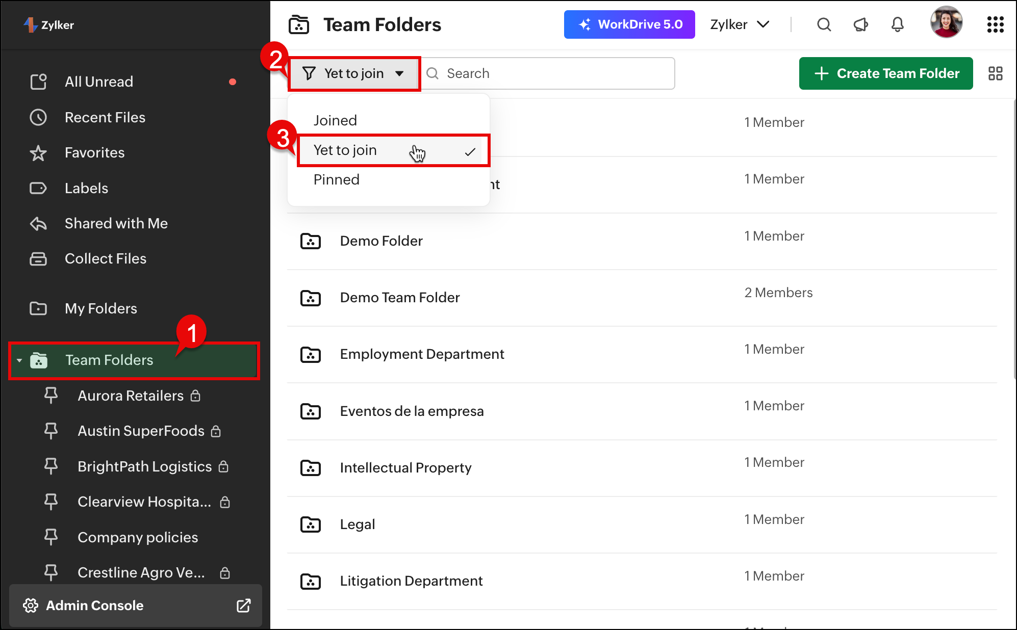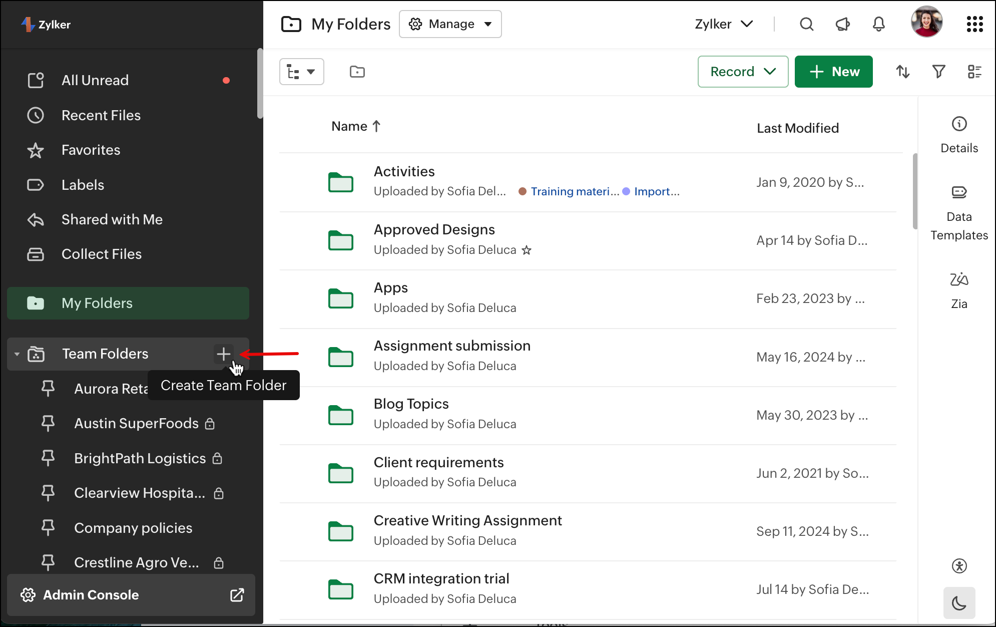 新規プロジェクトがチームで立ち上がる際、Zoho WorkDrive でいつでも新しい Team フォルダーを作成できます。プロジェクトやタスクの数に応じて、複数の Team フォルダーを作成し、必要に応じてチームメンバーを追加することが可能です。