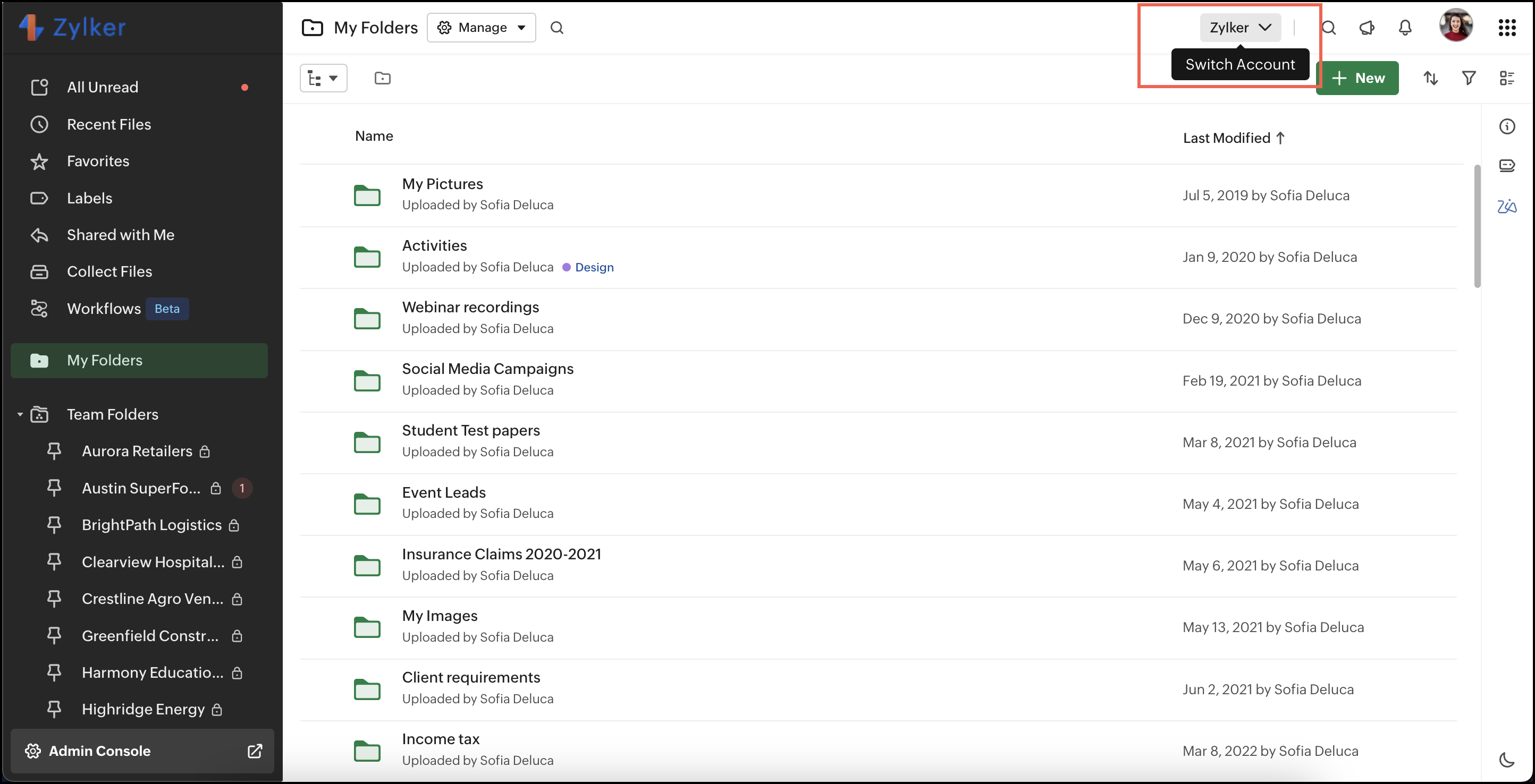 例えば、異なる3社のクライアントのマーケティングを担当している場合、それぞれのWorkDriveチームにすべて参加し、必要に応じてチームを切り替えることができます。この柔軟性により、適切なファイルへのアクセスや正しいメンバーとのコラボレーション、整理された状態の維持などが、1つのWorkDriveアカウントから実現できます。