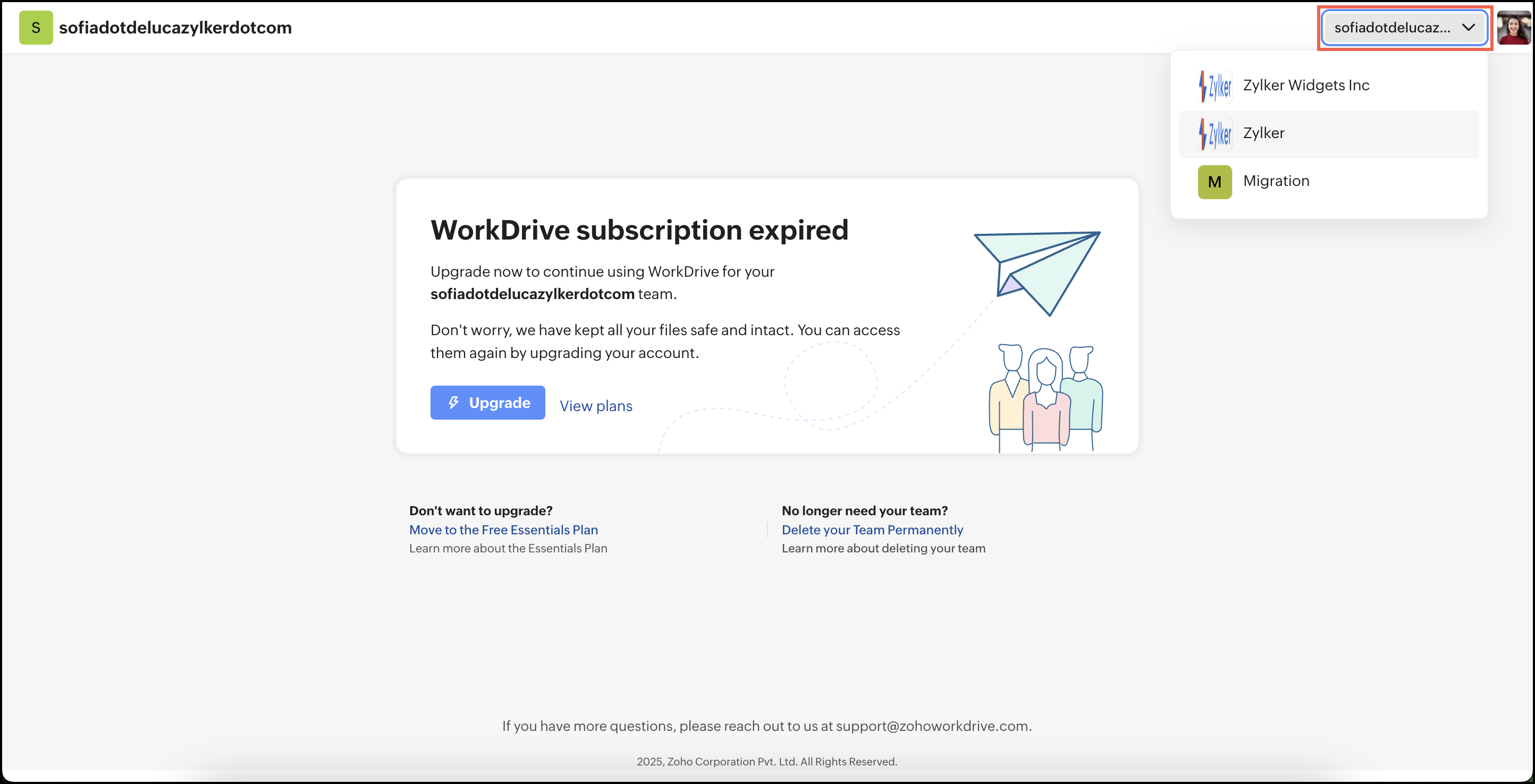 もしWorkDriveサブスクリプションの有効期限が切れた場合は、サブスクリプションをアップグレードするか、この機会に無料 WorkDrive Essentials プラン(5GB)を選択できます。