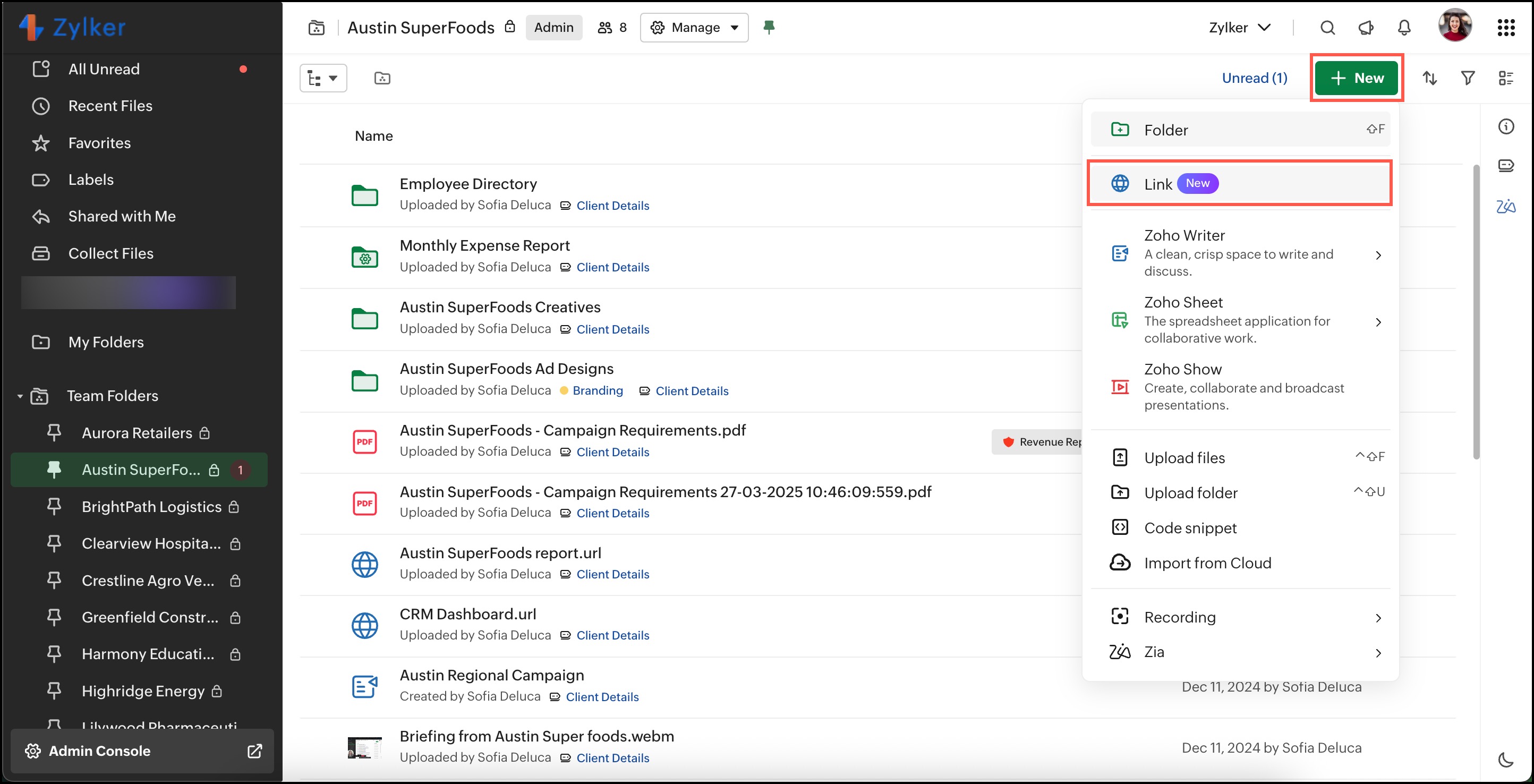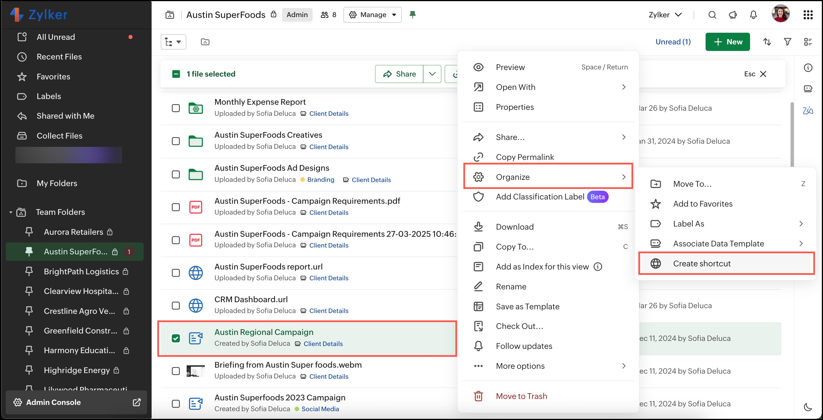 web URLのリンクを作成し、ファイルやフォルダーと一緒に保存することで、素早く整理されたアクセスが可能です。さらに、WorkDrive のファイルやフォルダーのショートカットを作成し、アカウント内の異なる場所に保存できます。これにより、重複を避け、フォルダーの管理も簡単になります。