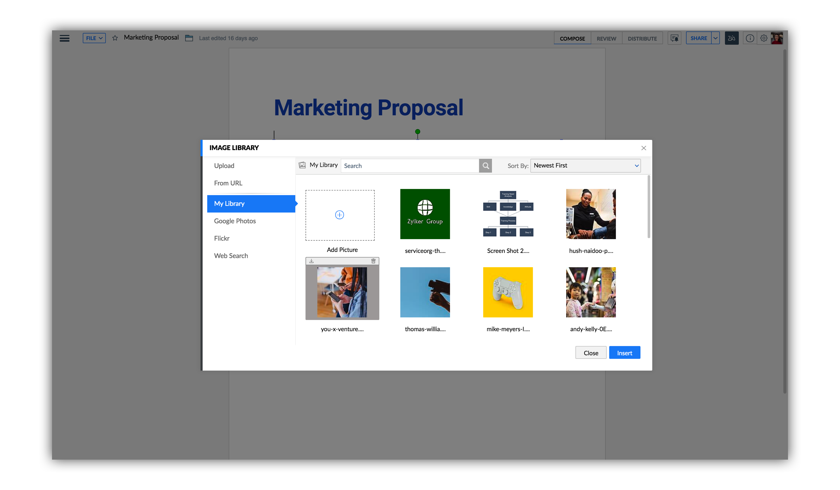 4. WorkDrive ライブラリで利用可能な画像一覧から必要な画像を選択し、挿入 をクリックします。