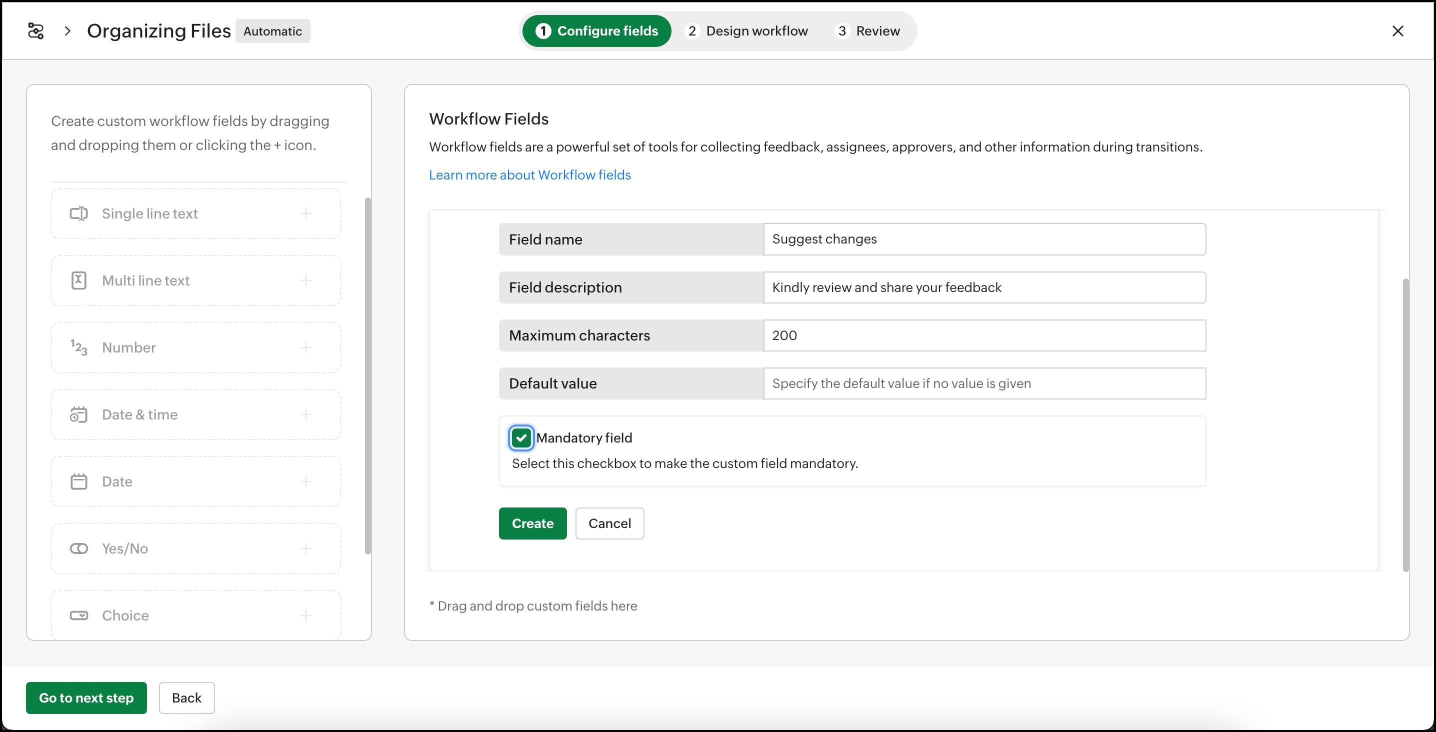4. ワークフロー開始前にユーザーがこの情報を入力することが必須の場合は、Mandatory 項目オプションをチェックして必須項目として設定します。