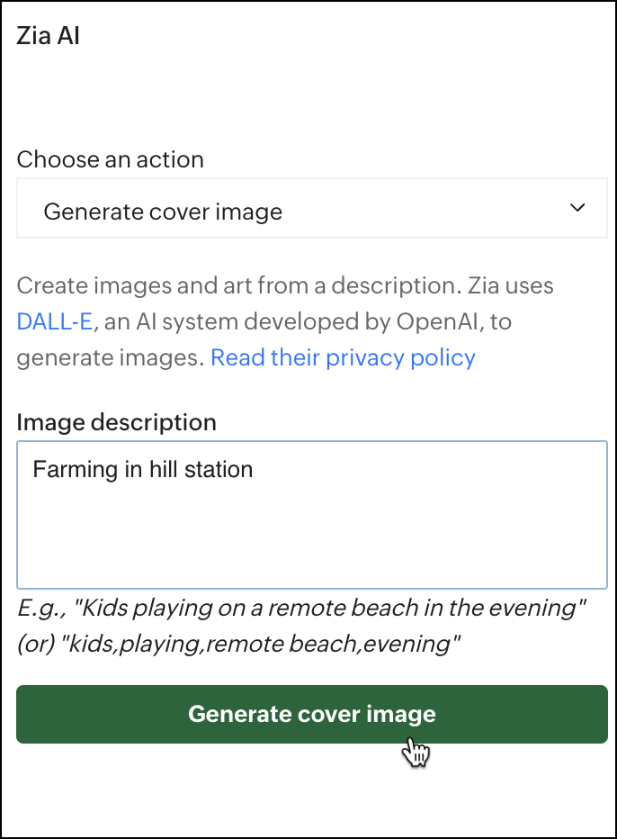 Zia AIウィンドウが開き、生成する cover 画像オプションが初期設定で選択されます。