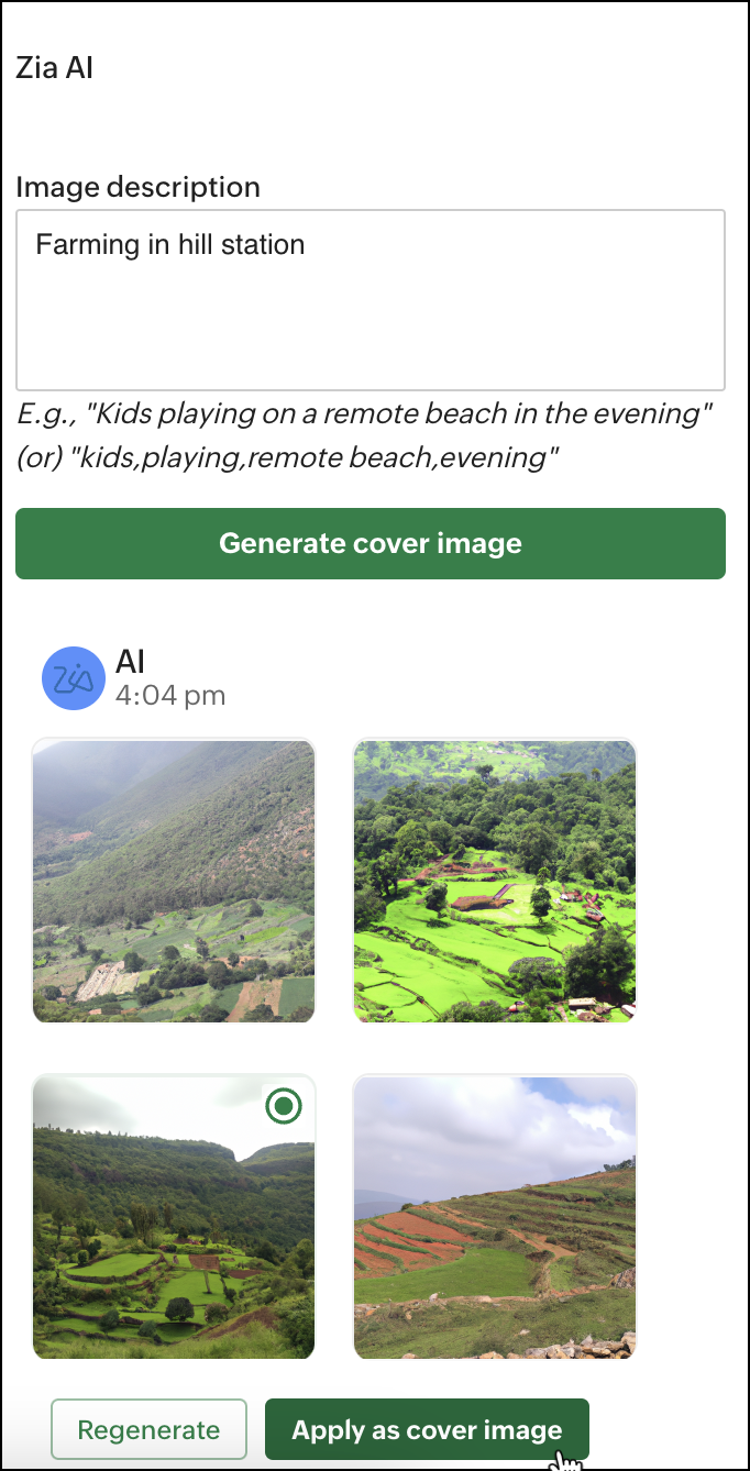 または、オーディオまたはビデオファイルをプレビューするで開き、右ペインの 詳細アイコンをクリックします。選択する 変更する cover 画像 > Zia AI を使用して画像を生成するオプションを選択します。