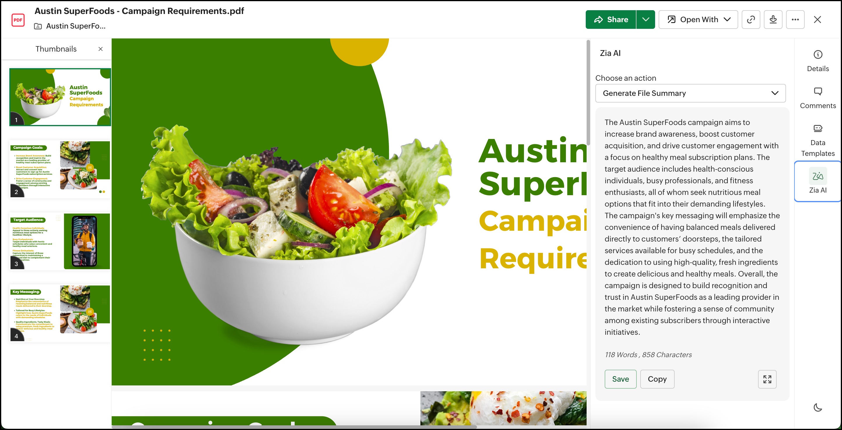 1. Zoho AI:ファイルの最初の100,000文字までをインデックスし、概要を生成します。