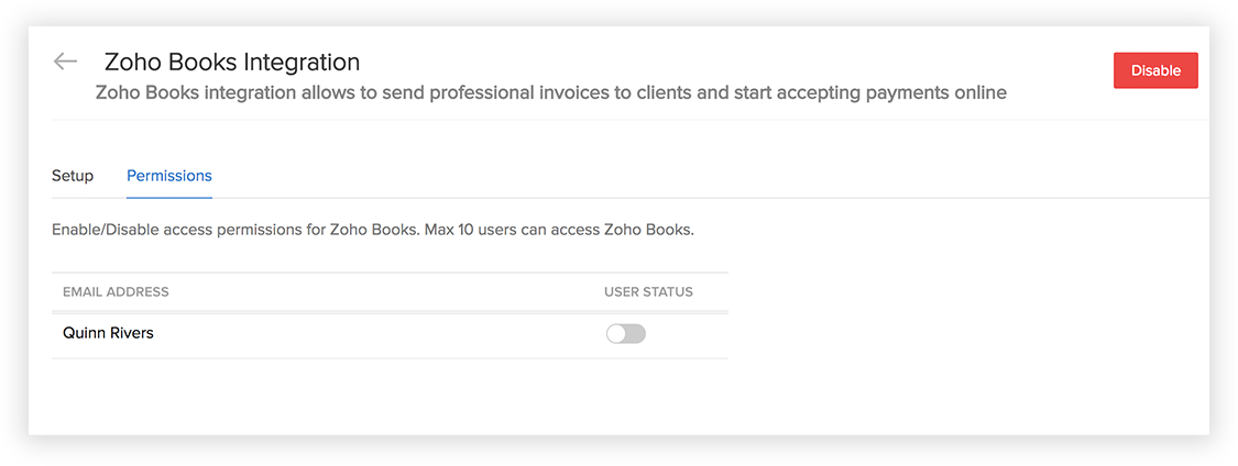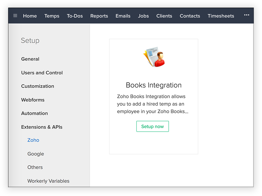 ケース1:Zoho BooksおよびZoho Invoiceの両方が新規ユーザーの場合、Zoho Workerlyにユーザー登録すると同時に、システムがアカウント作成を開始します。設定 > 拡張機能 & APIs > Zohoに移動し、Zoho Books連携ウィジェットで管理をクリックしてください。