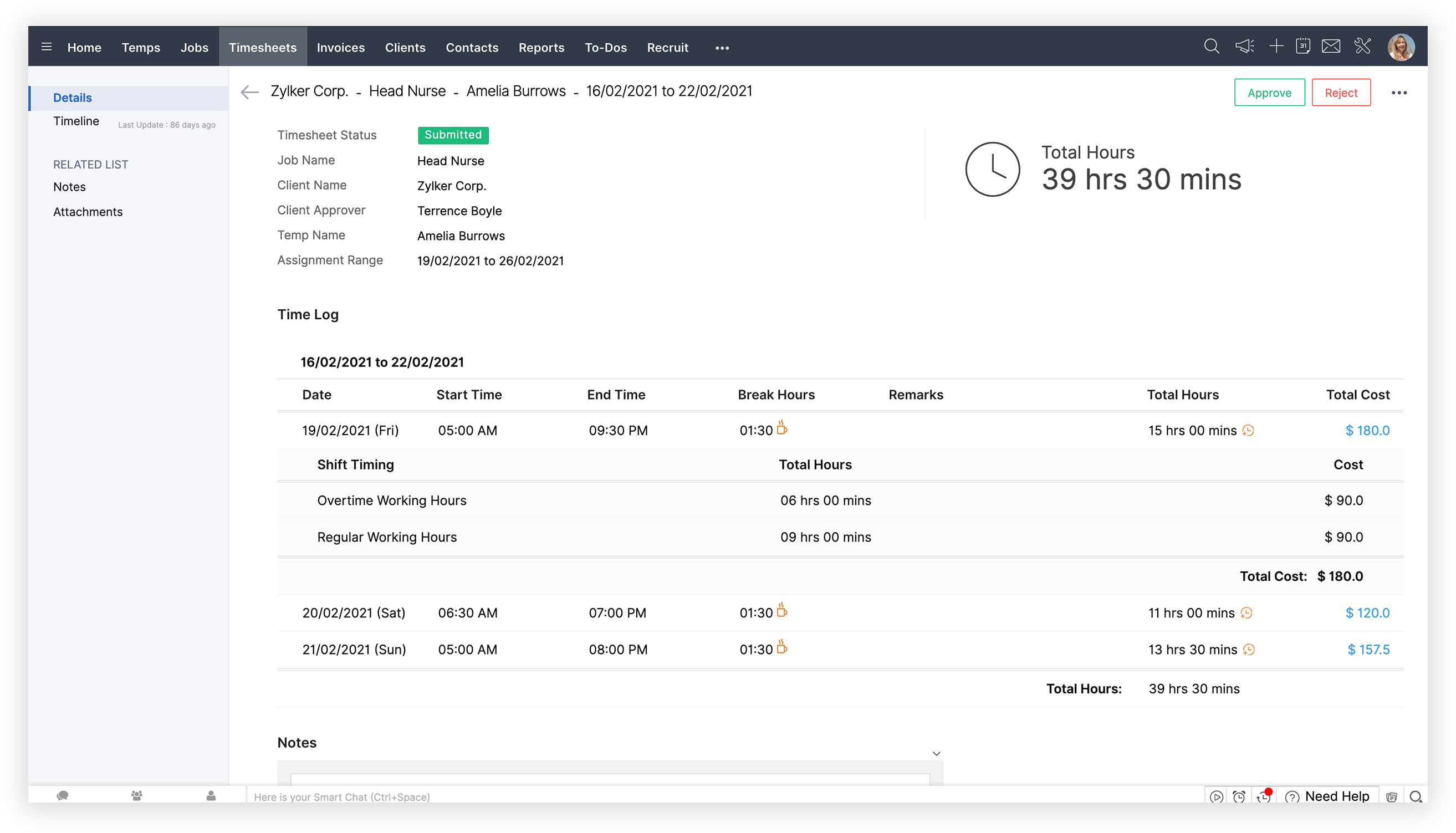 AgencyまたはClient承認を選択している場合、指定された承認者にはメールで送信済み工数表について通知されます。承認者は工数表を確認し、承認または却下を選択できます。