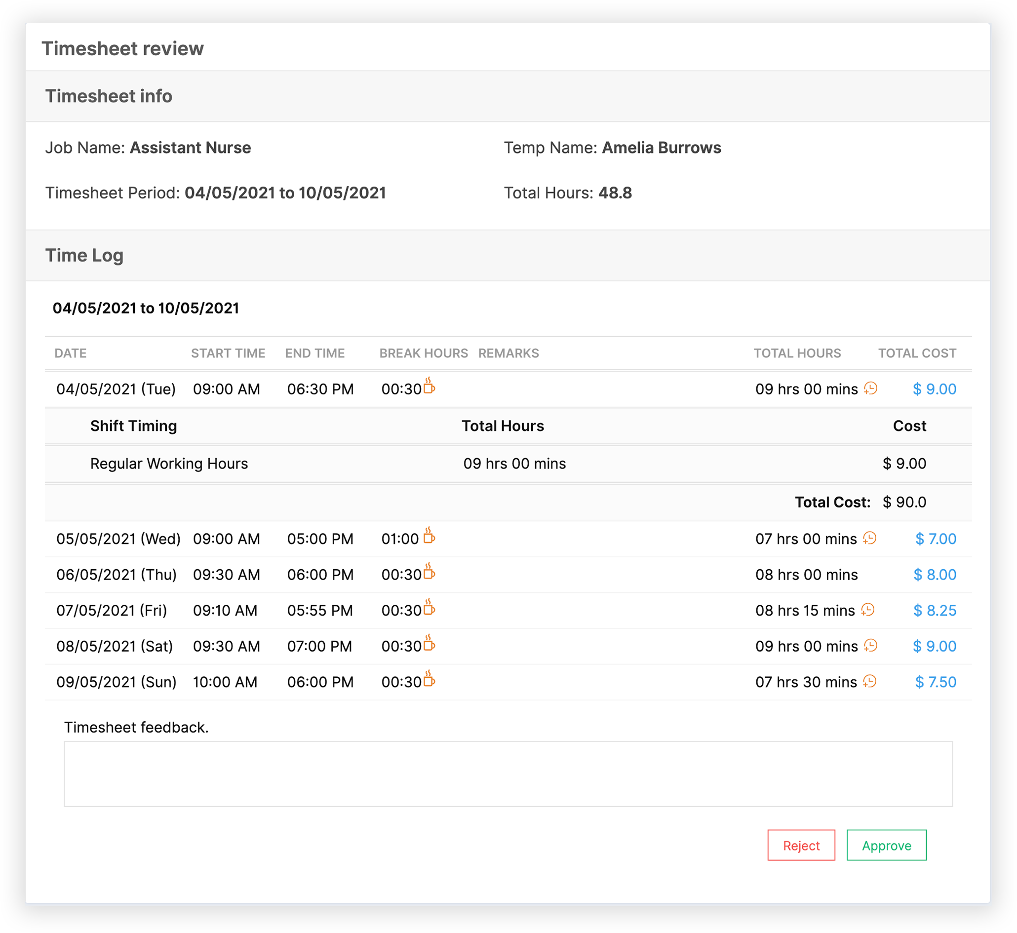 この設定が有効になると、temps はシフトの最終勤務日の前に工数表を事前記入・提出できます。これは、週末や月末など、ジョブの請求間隔によって異なります。