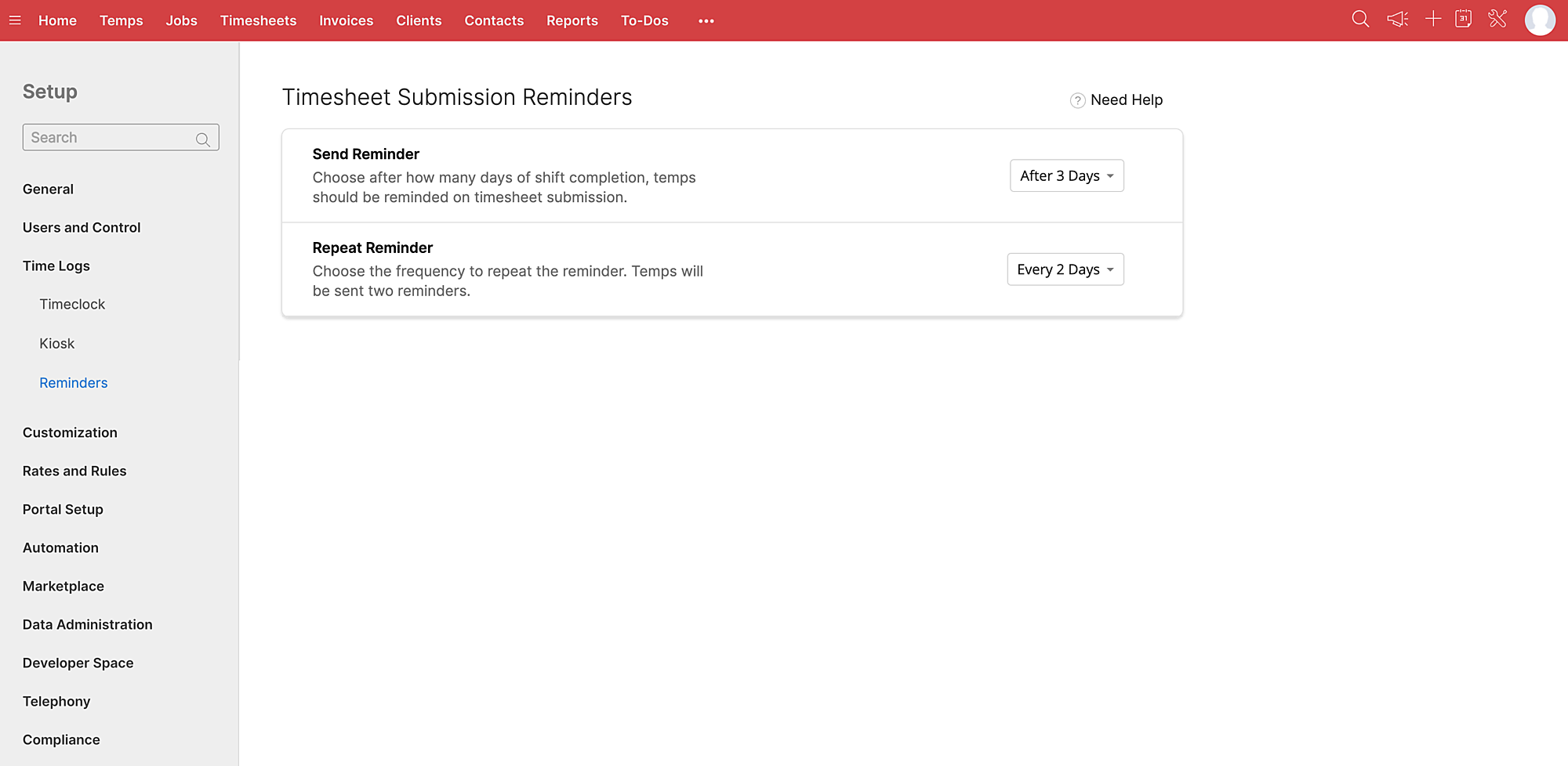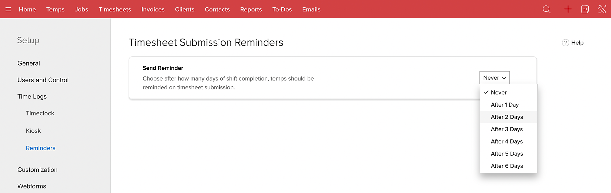 例えば、一時スタッフが7月15日に勤務を終了した場合、が次の後 2 日を選択すると、7月17日に工数表の提出リマインダーが送信されます。