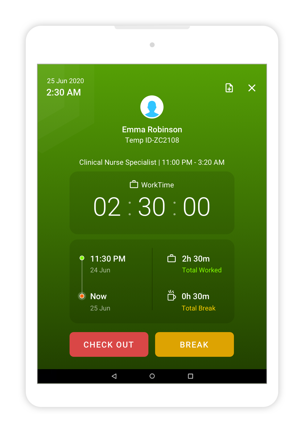 アプリを使って休憩時間も記録できます。Breakをクリックすると休憩時間が記録され、Check-出力をクリックするとシフト終了時間が記録されます。