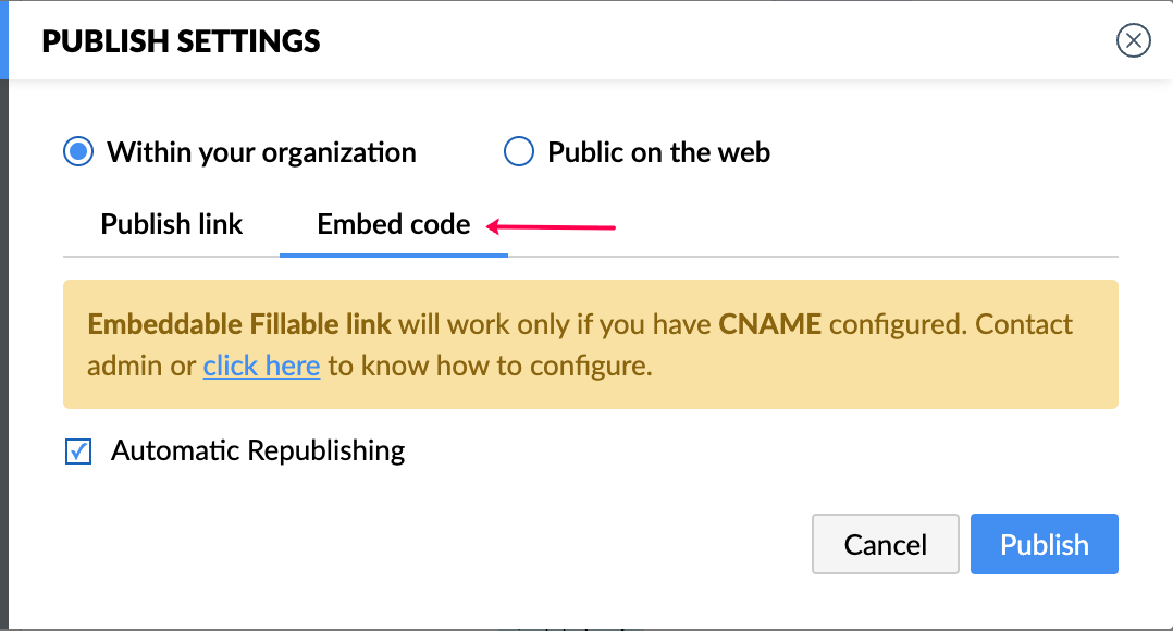 メモ: セキュリティ上の理由から、入力可能フォームは同一オリジンまたは同一ドメインで読み込まれるページにのみ埋め込むことができます。フォームを Web サイトに埋め込むには、有効な CNAME レコードでカスタムドメインが設定されていることを確認してください。