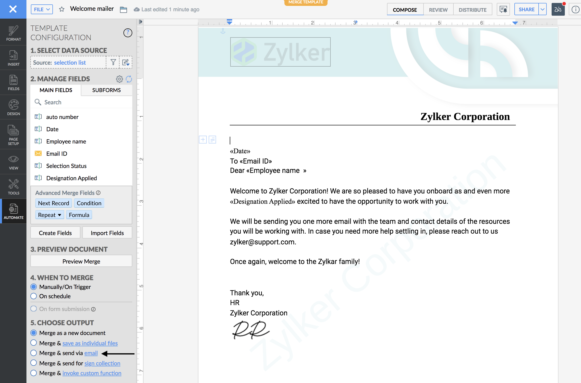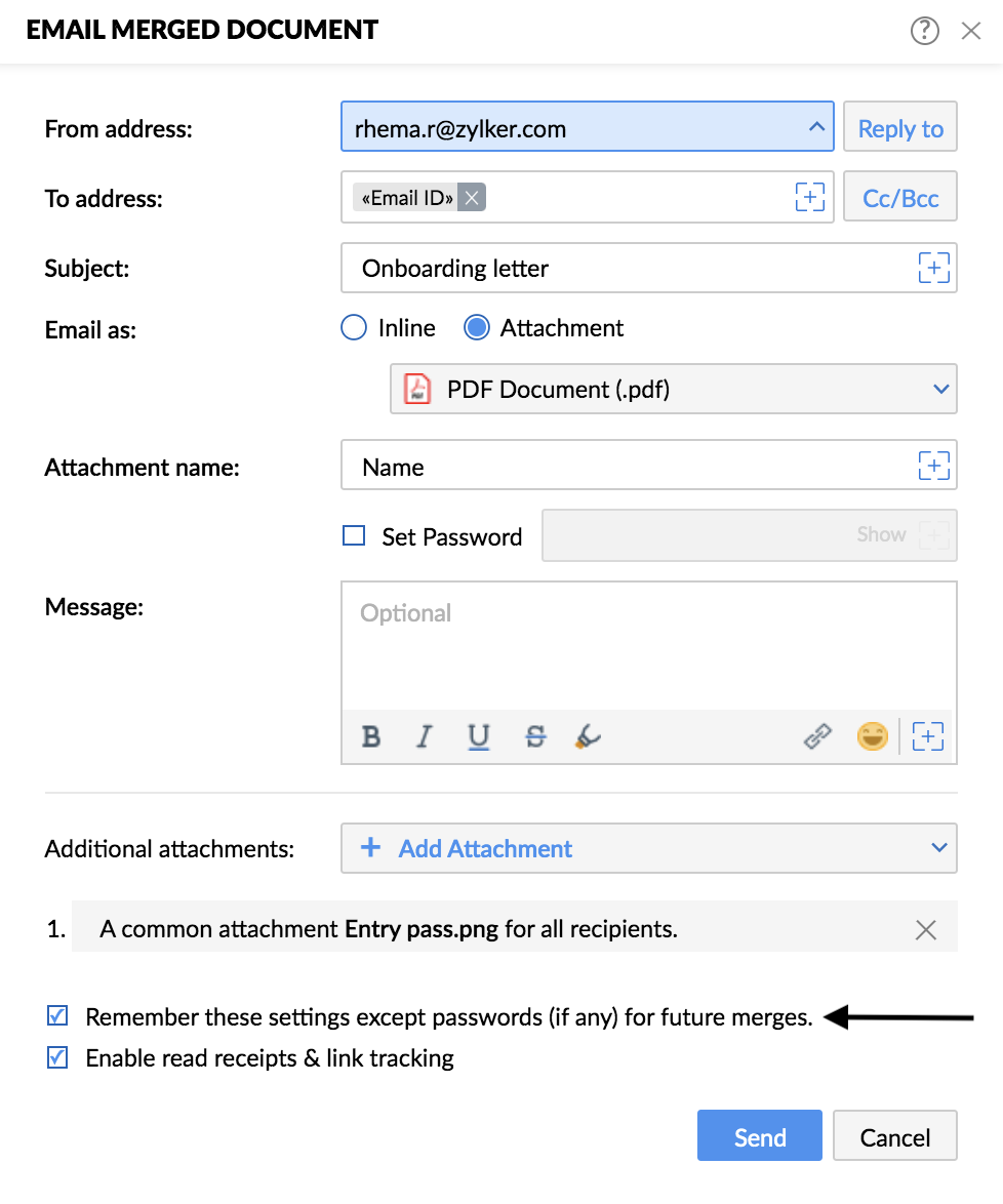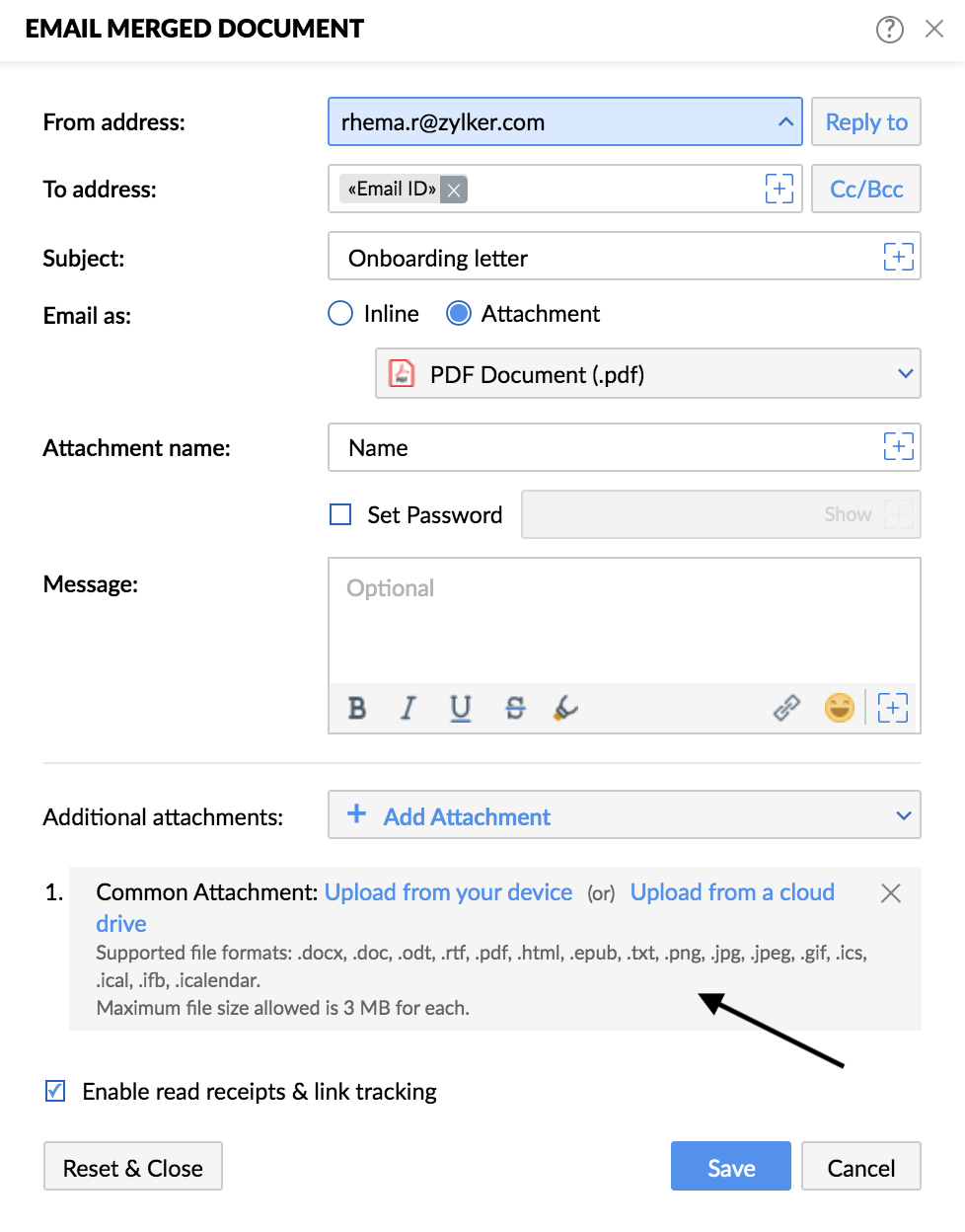 Zoho Writerでは、メールマージメールに1つまたは複数の添付ファイルを追加できます。項目変数を使用して、受信者ごとにパーソナライズされたユニークな添付ファイルを追加したり、共通の添付ファイルをメールマージテンプレートに追加したりすることが可能です。