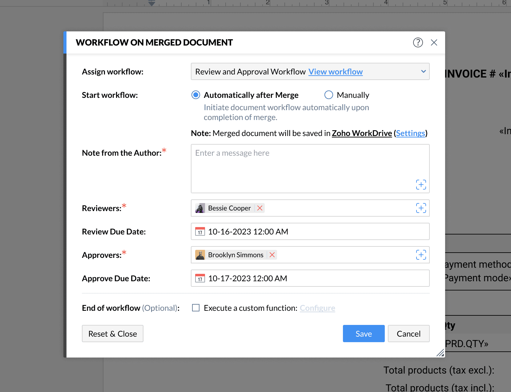 - 管理項目を使い、ドキュメント内にマージ項目(例:名前、メール、金額)を追加します。