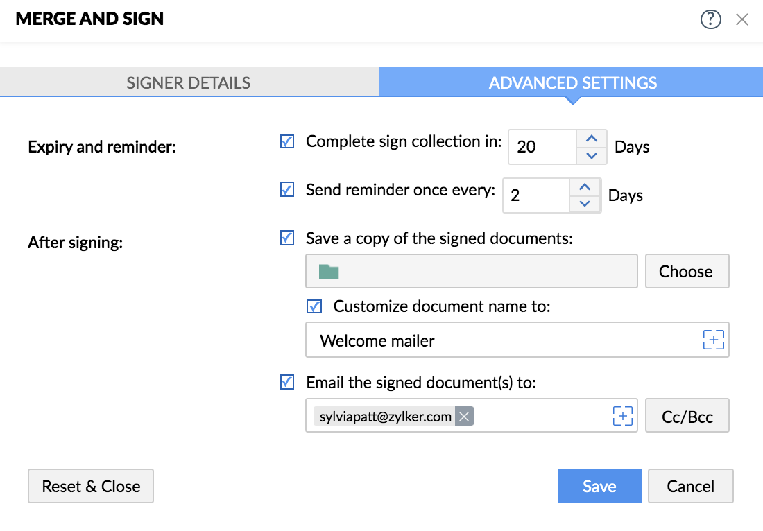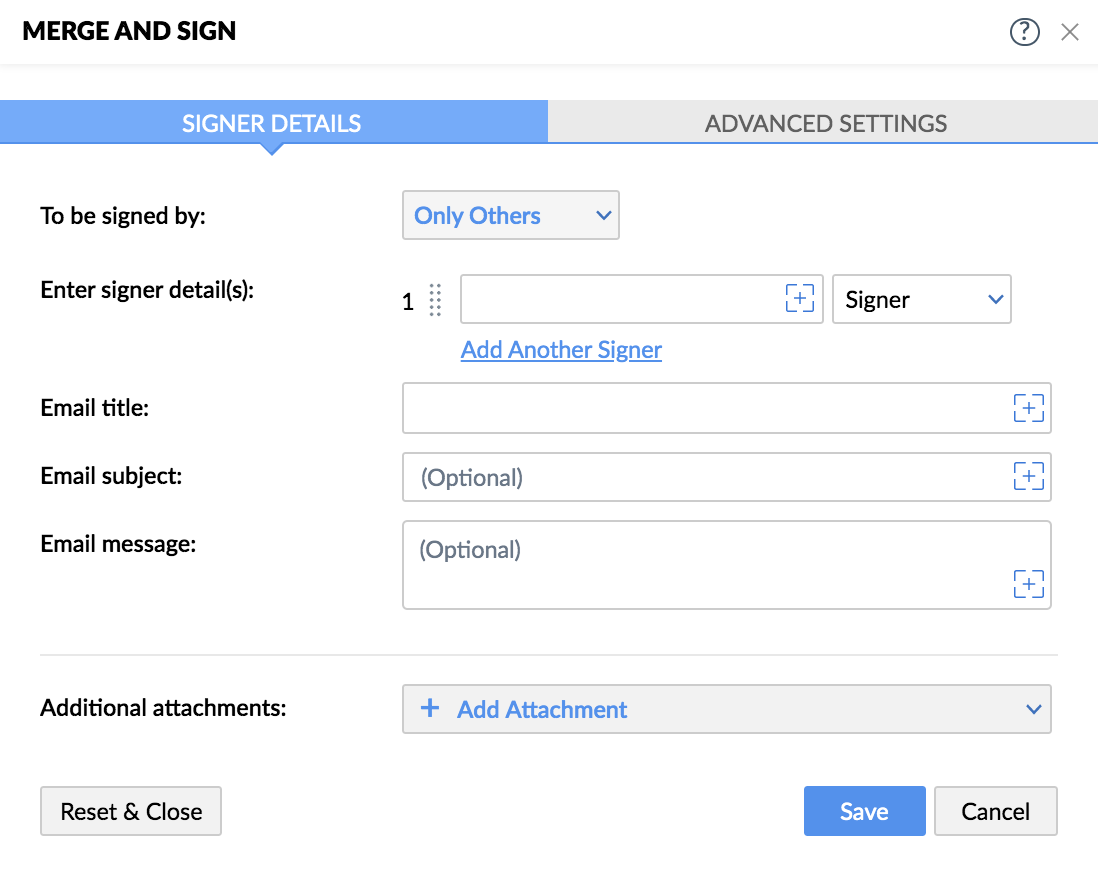 Merge and Signポップアップで、Signer 詳細タブに署名者の情報を入力します。