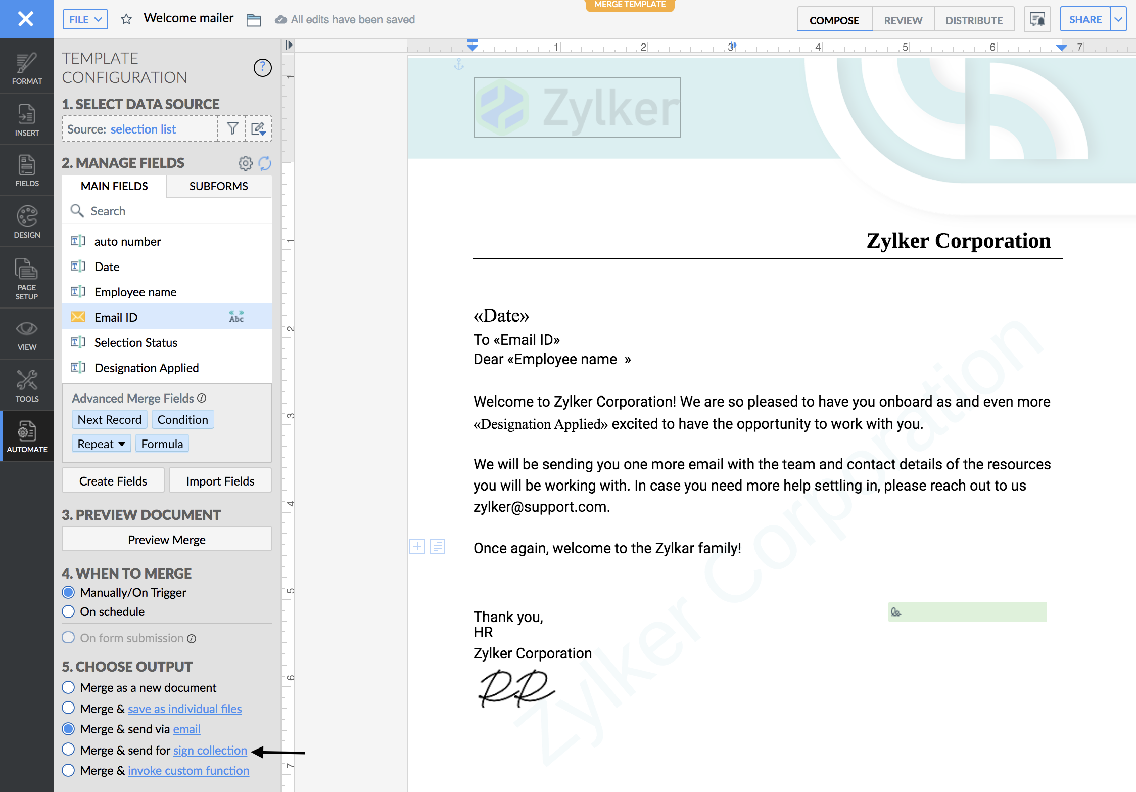 データ元を選択し、テンプレートにマージ項目や署名者項目を挿入した後、OutputからMerge & 送信する for sign コレクションをクリックします。