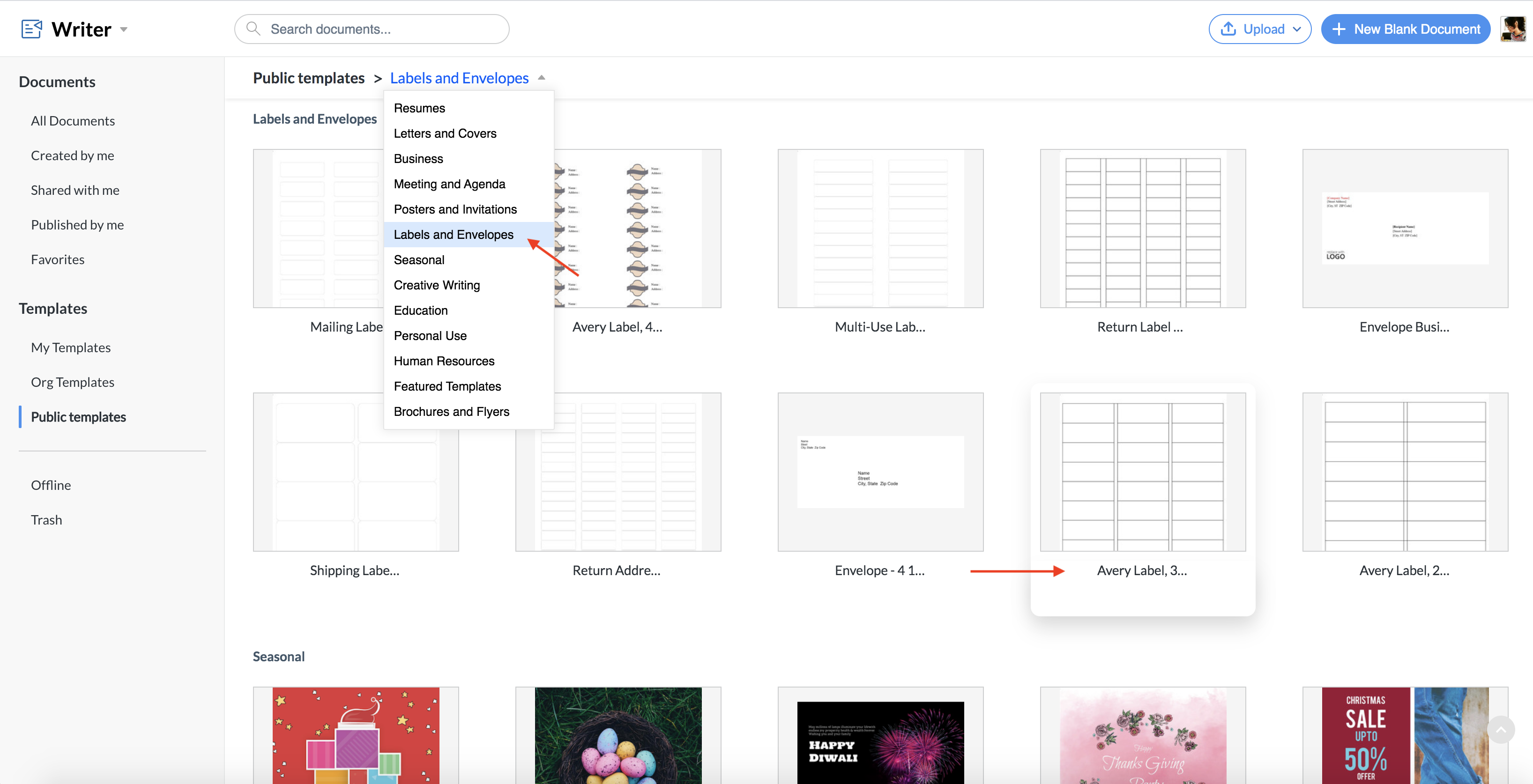 1. 公開する テンプレート > Labels and Envelopes > Avery ラベル に移動します。
