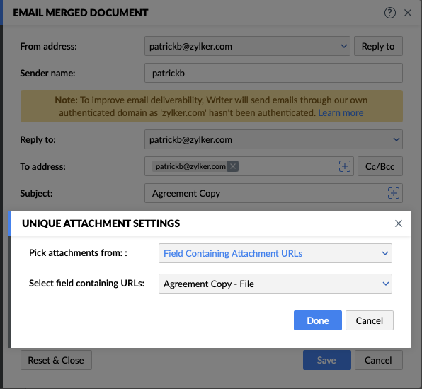 フォーム申請者がアップロードしたファイルは、設定に応じてPDF内に埋め込むか、個別の添付ファイルとして追加できます。これにより、すべての送信済みデータや関連ドキュメントが最終的なメールマージ出力にまとめられます。