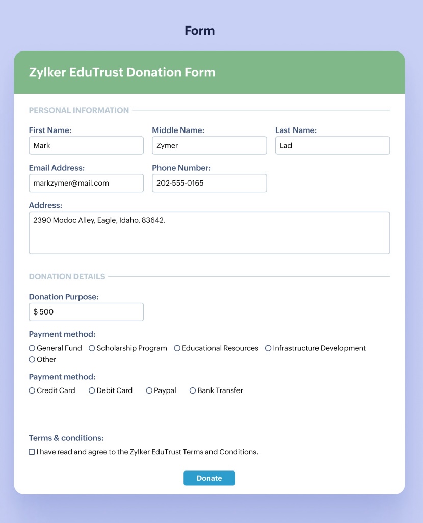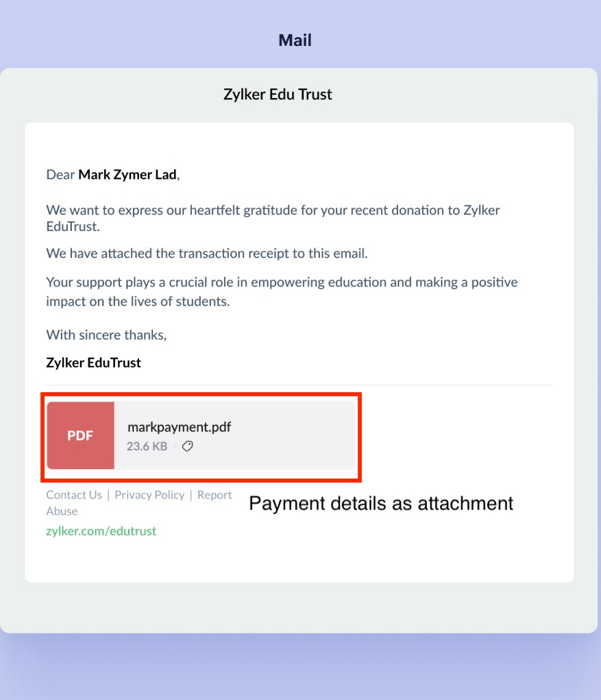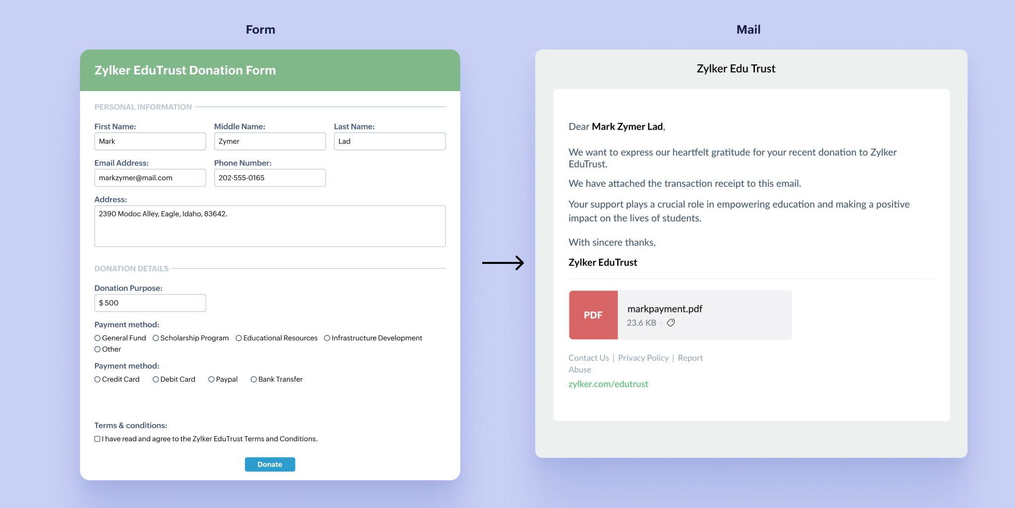 Zoho Forms の支払い項目から支払いの詳細を取得し、必要な詳細を表示します。支払いの詳細はドキュメントとして表示することも、メールでインラインまたは添付ファイルとして送信することもできます。