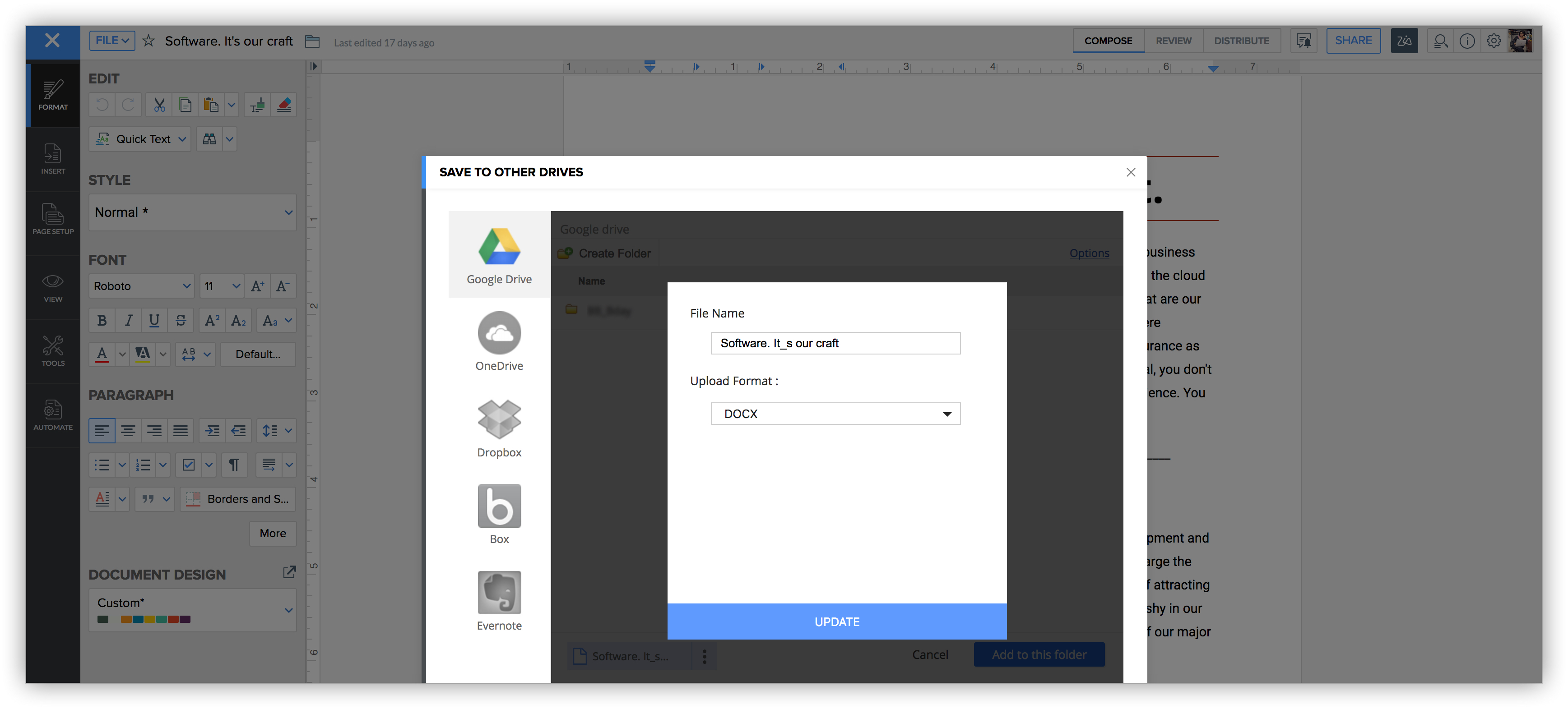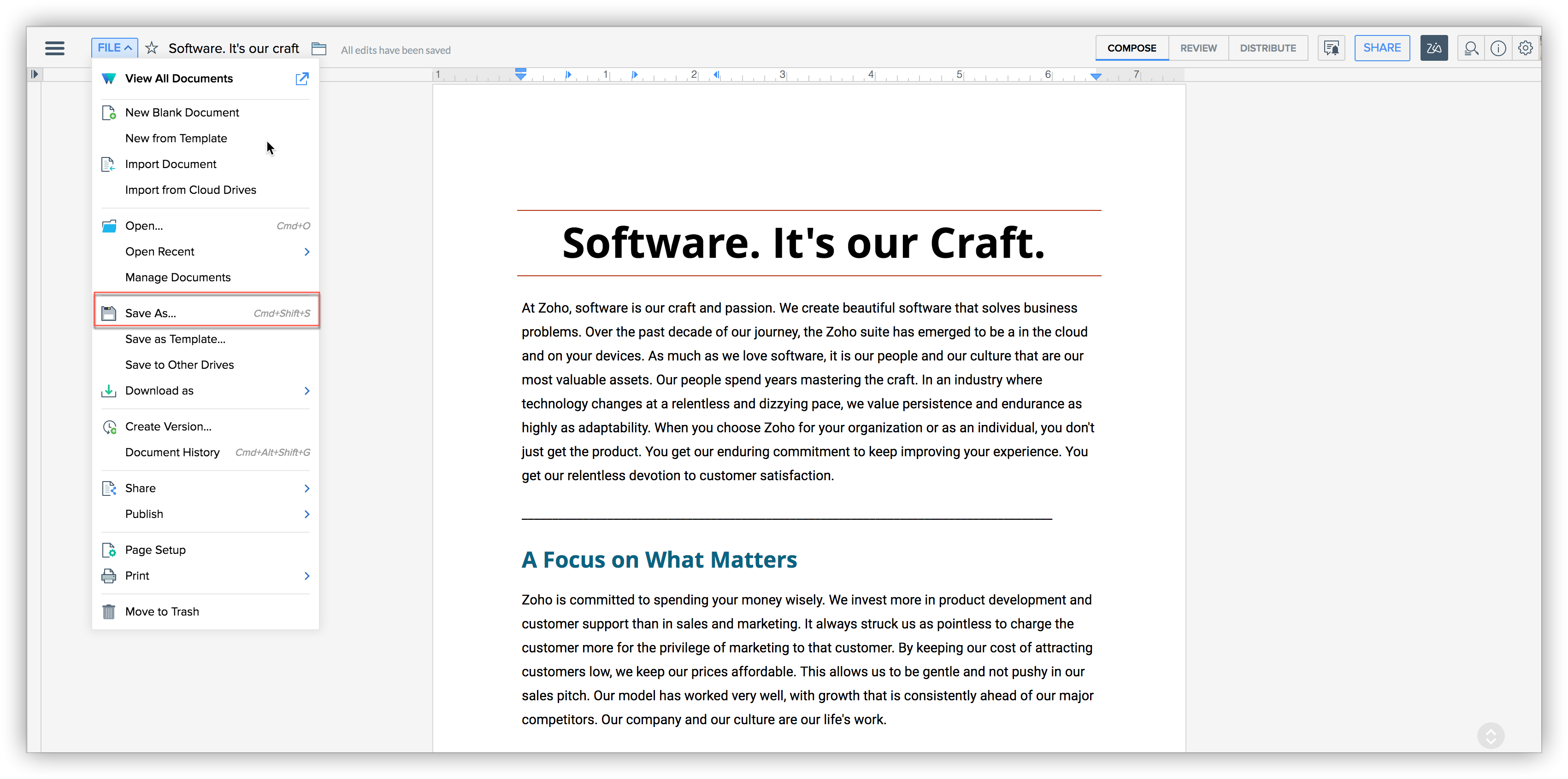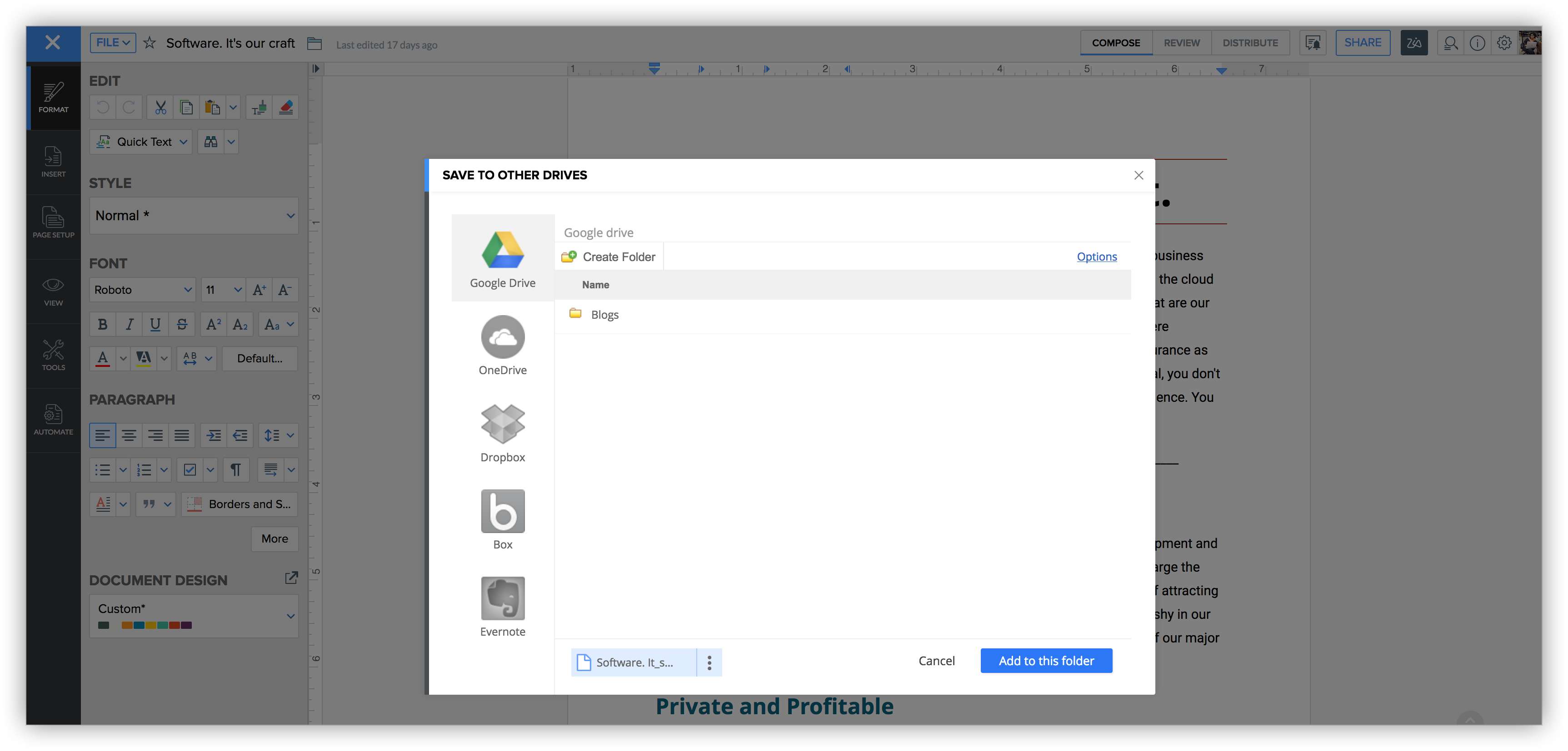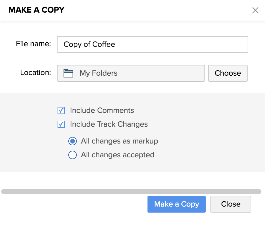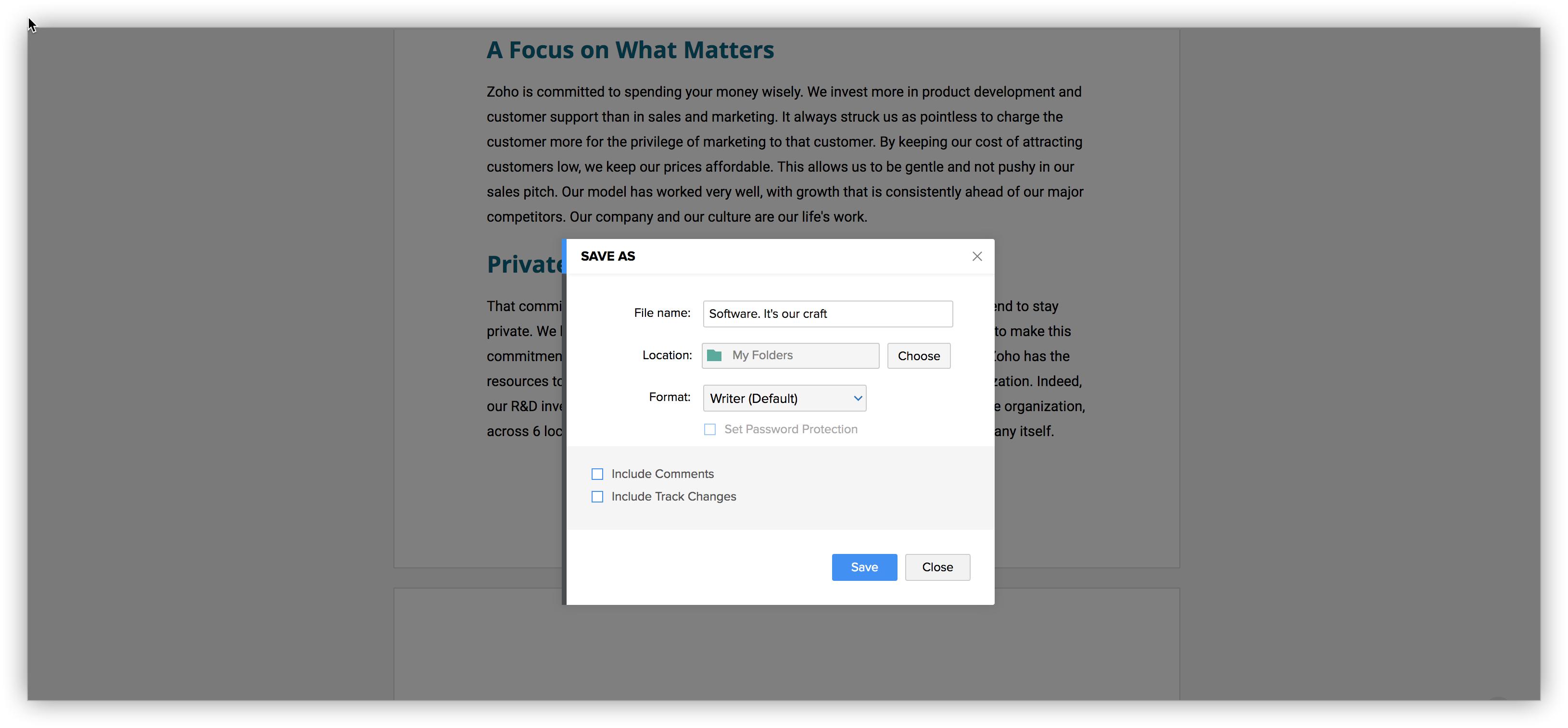 ドキュメントのプロパティウィンドウには、件名、担当者、バージョン番号、パーマリンク、ドキュメントのアクセス情報、場所、公開ステータス、作成日、更新日、ページ数、文字数、単語数などの詳細が表示されます。