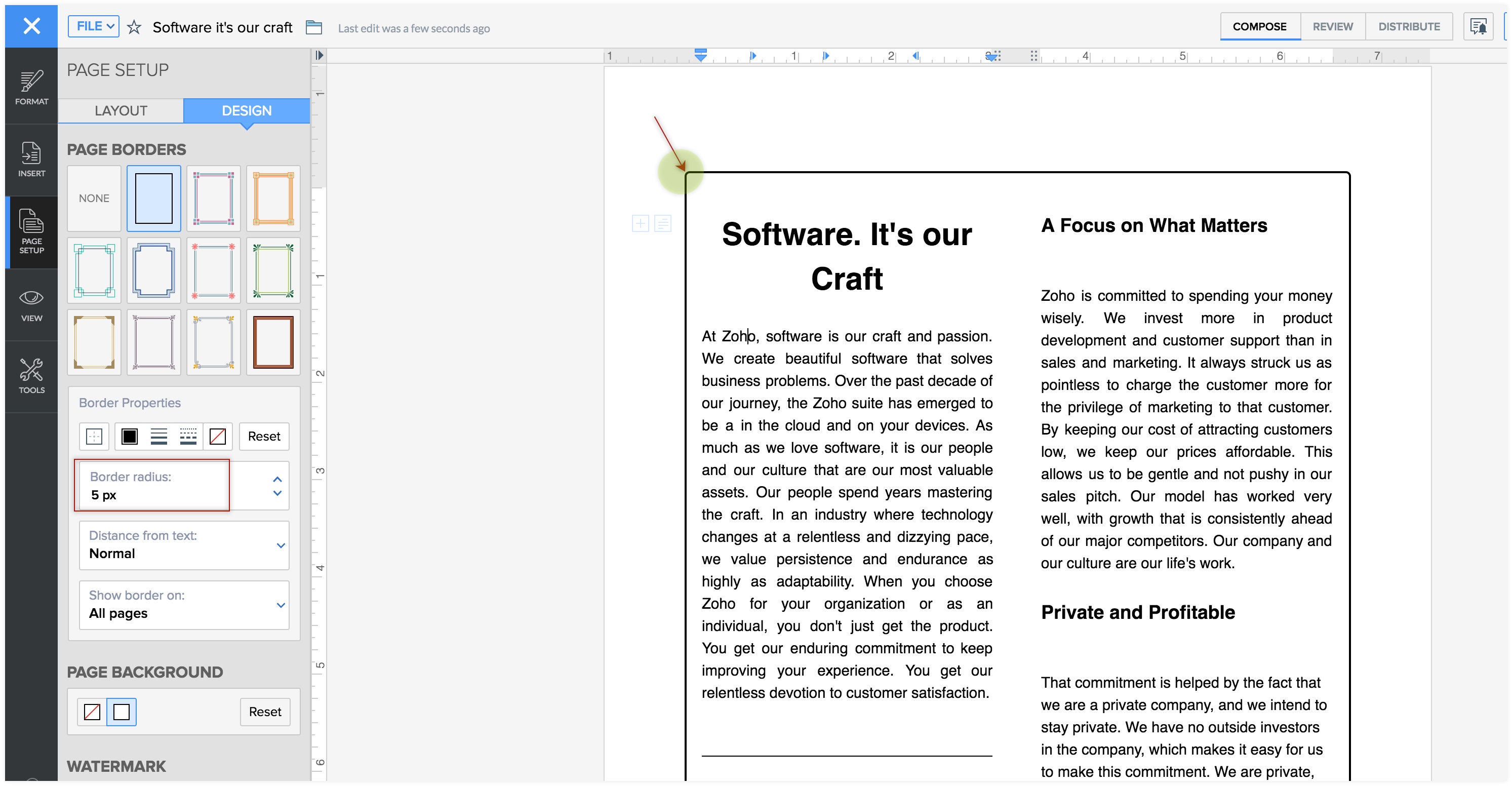 Writer では、ドキュメントのページにシンプルな罫線や画像罫線を追加できます。ページ罫線は、装飾やフライヤー、証明書の作成などに活用できます。