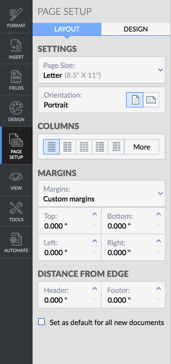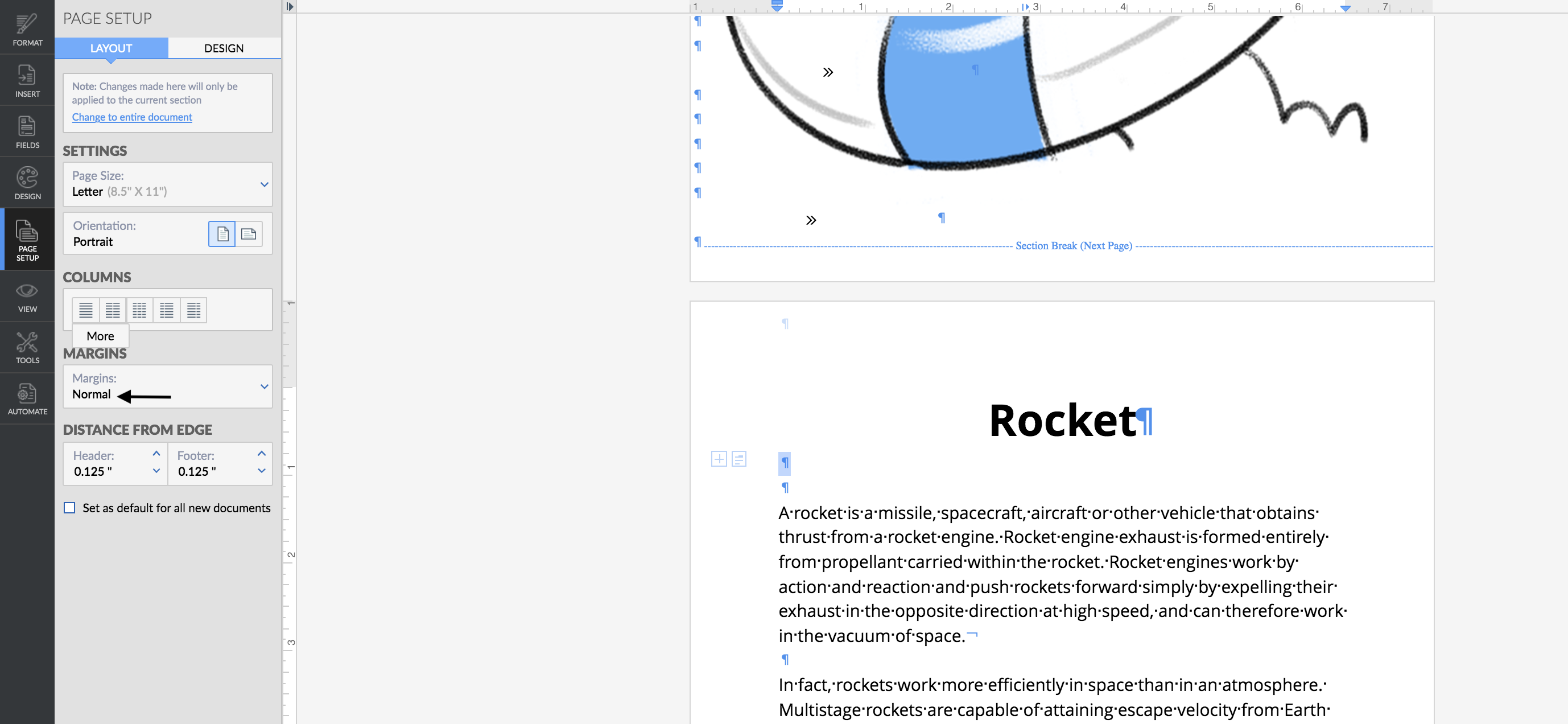 1. ドキュメントを開き、表紙画像を追加したいページへ移動します。その後、ページ設定 > 余白 > カスタム余白を選択します。上下左右の余白幅に'0'を設定し、端からの距離にも '0' を入力します。