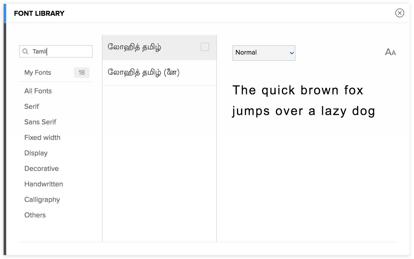 Libraryの検索機能を利用して、特定の言語をサポートするフォントを見つけます。行うには+フォントを追加するボタンをクリックし、Libraryにナビゲートし、検索ボックスに希望する言語を入力します。