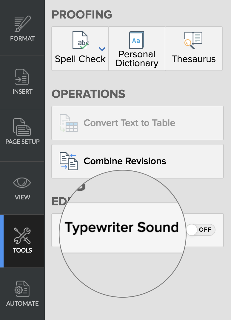 タイプライター音を有効にするには、その他の設定(☰)> ツール > 編集 > タイプライター音に移動します。