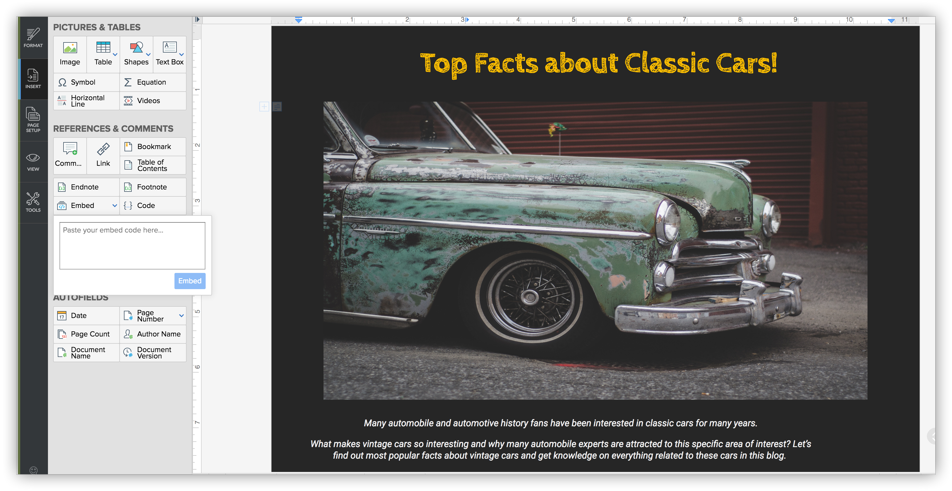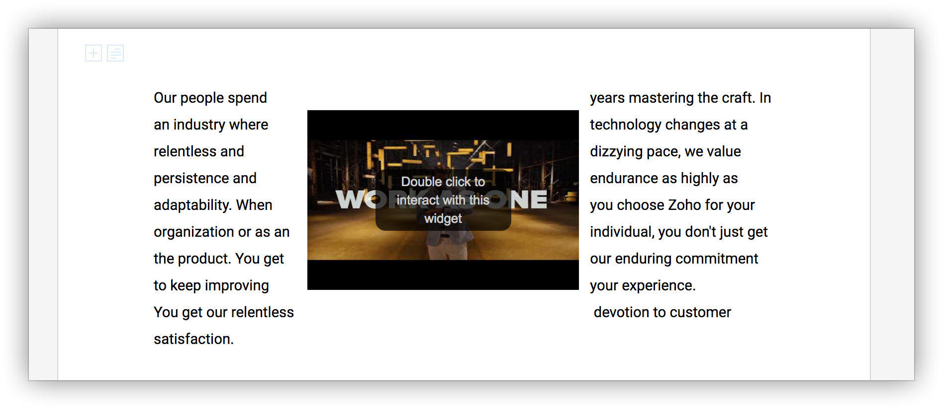 埋め込みオプションを使用して、ファイル間でグラフ、動画、プレゼンテーションを追加できます。Writerドキュメント内では、Zoho Showの公開済みプレゼンテーション、Zoho Sheetのグラフ、Zoho レポートのレポートを埋め込むことが可能です。