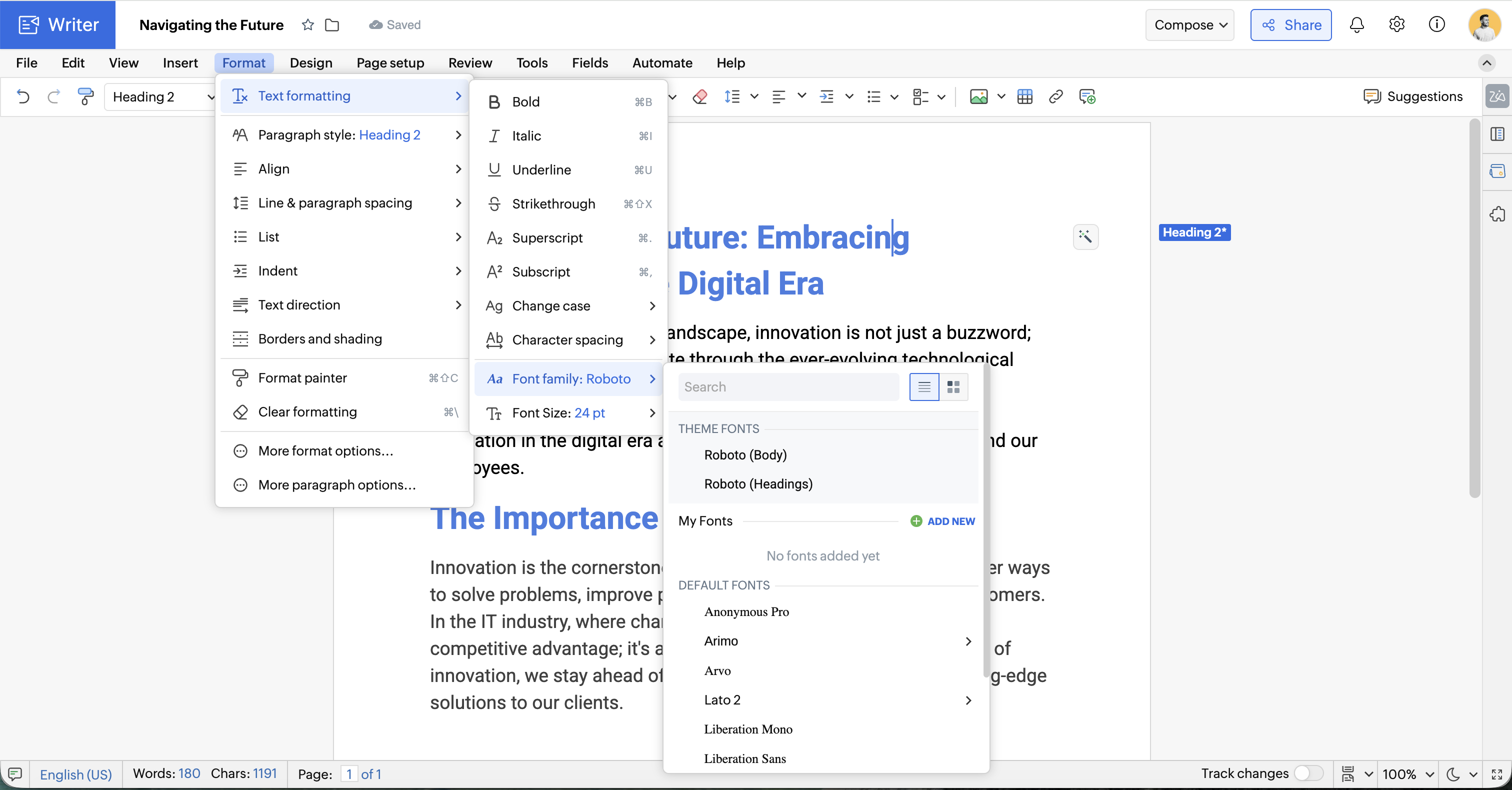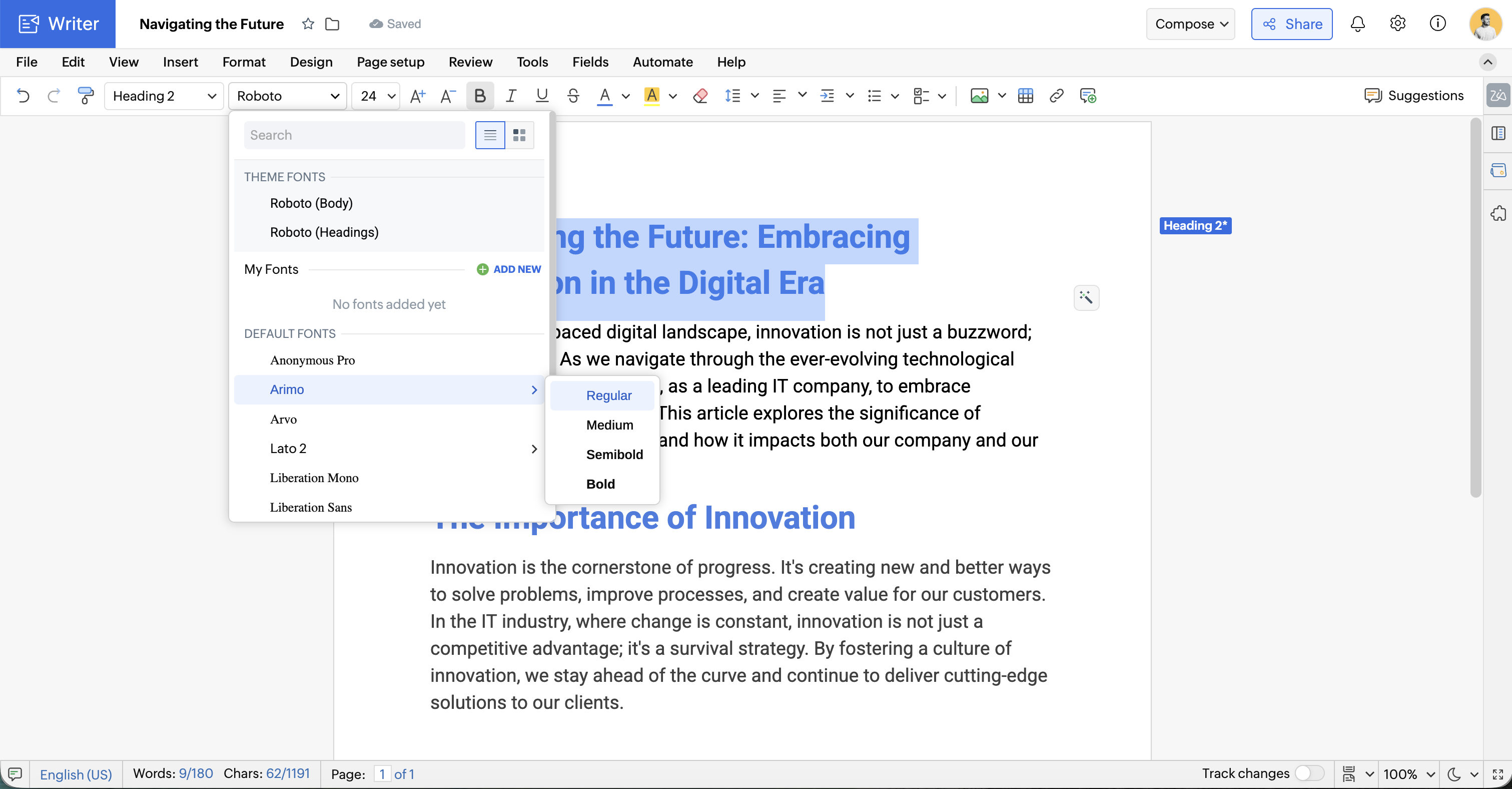 Zoho Writer では、新しいフォントを追加したり、ドキュメント内のテキストのフォント、サイズ、太さを変更したりできます。