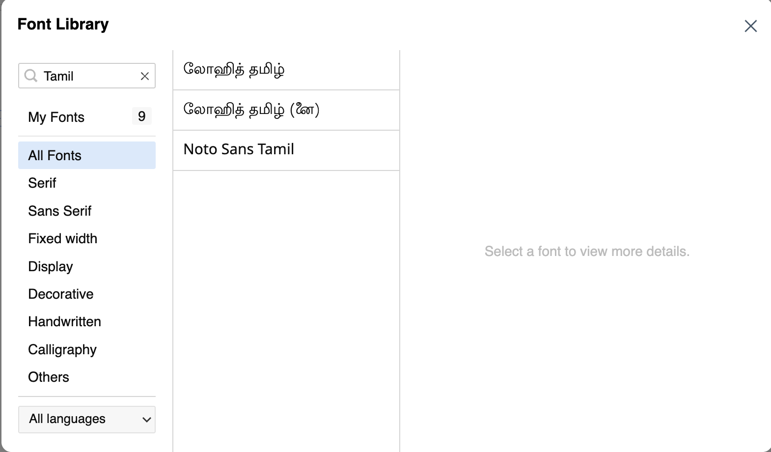[フォントライブラリ]ポップアップで、検索ボックスにフォント名を入力して目的のフォントを検索できます。また、ドロップダウンから言語を選択すると、その言語に対応したフォントのみが表示されます。