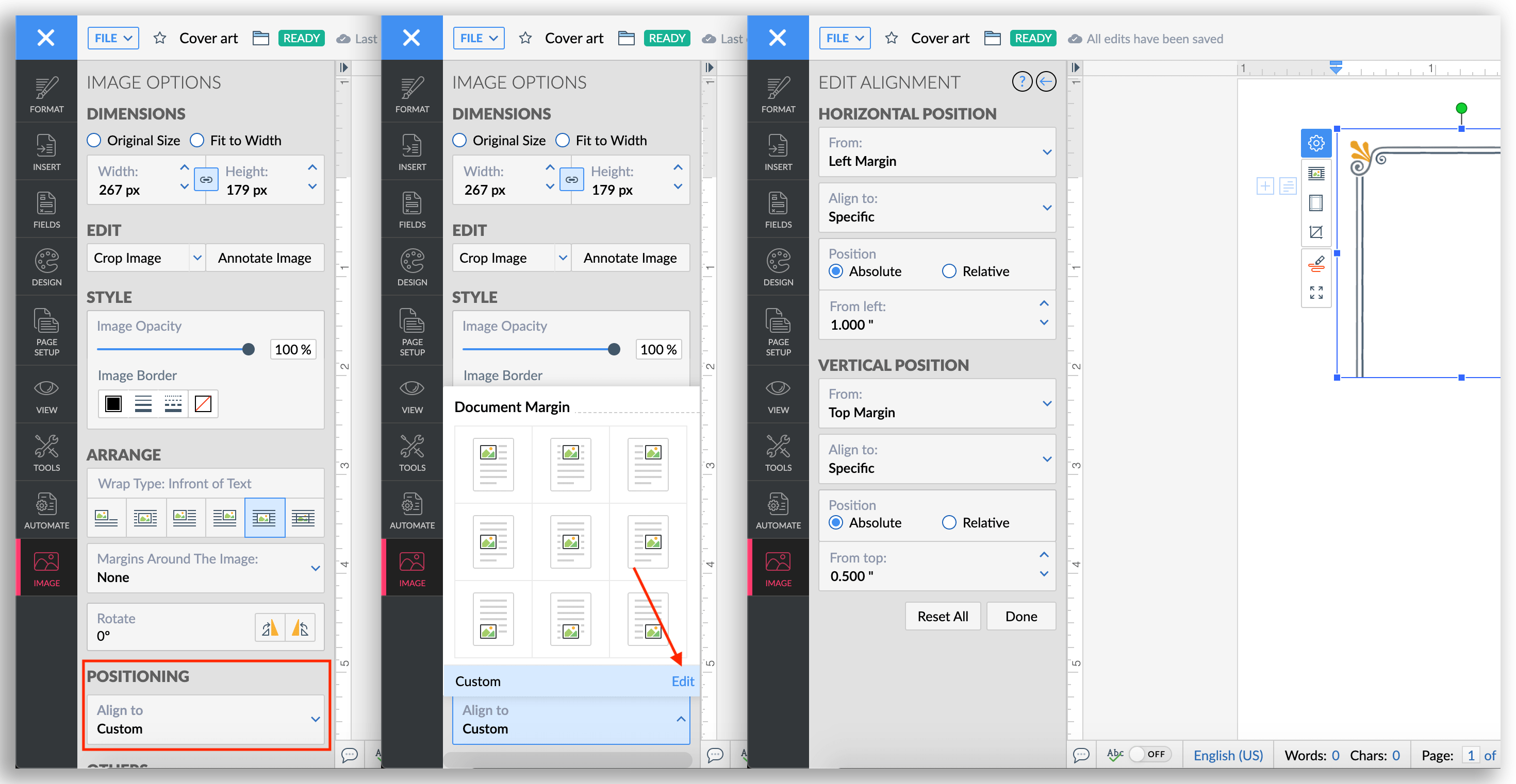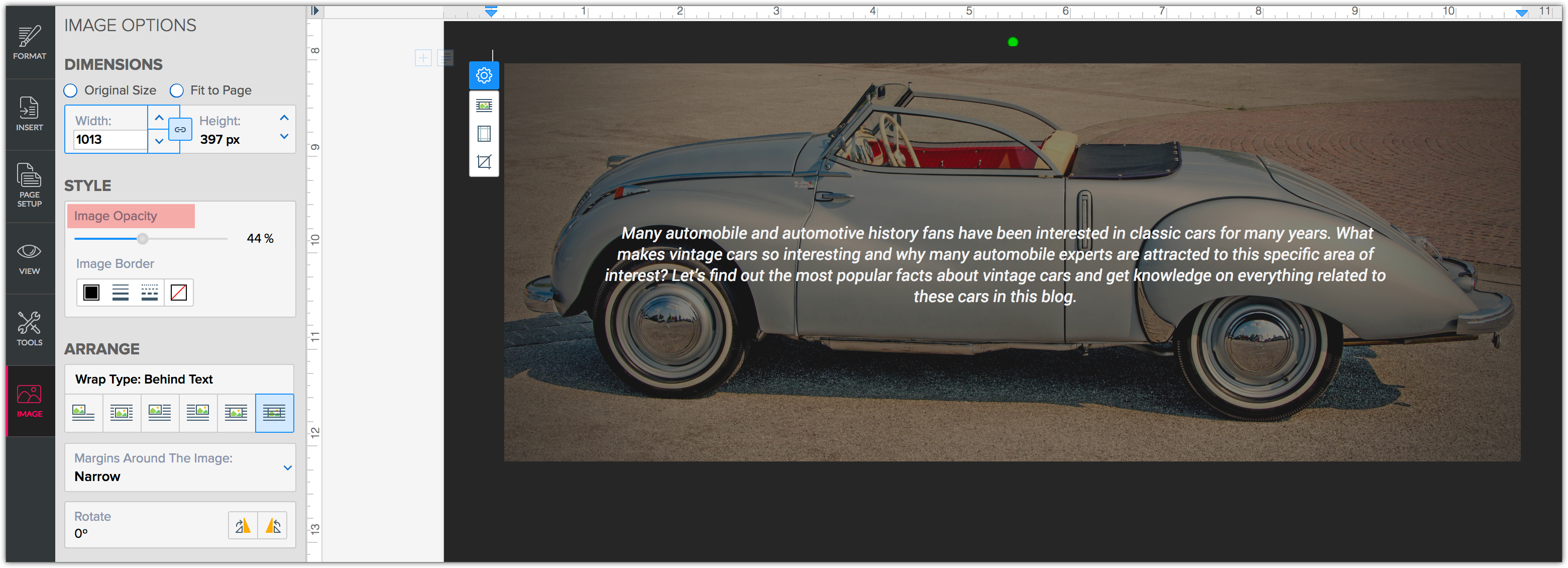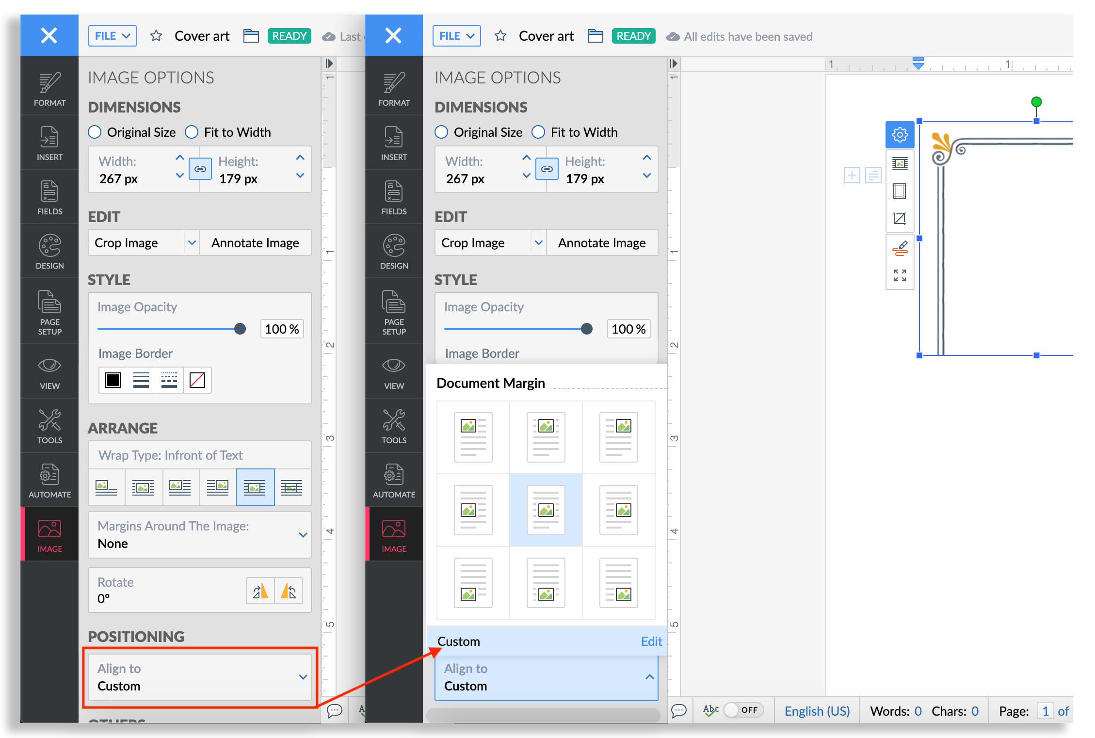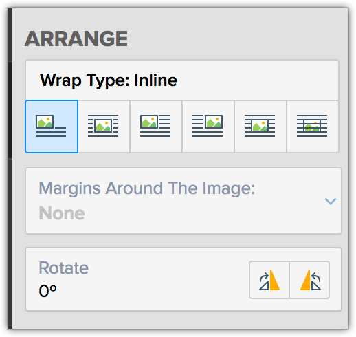 - Arrangeヘッダーで、折り返し種類を選択します。選択した種類が画像に適用されます。また、選択した画像の周囲のマージンを設定したり、画像を回転したりできます。