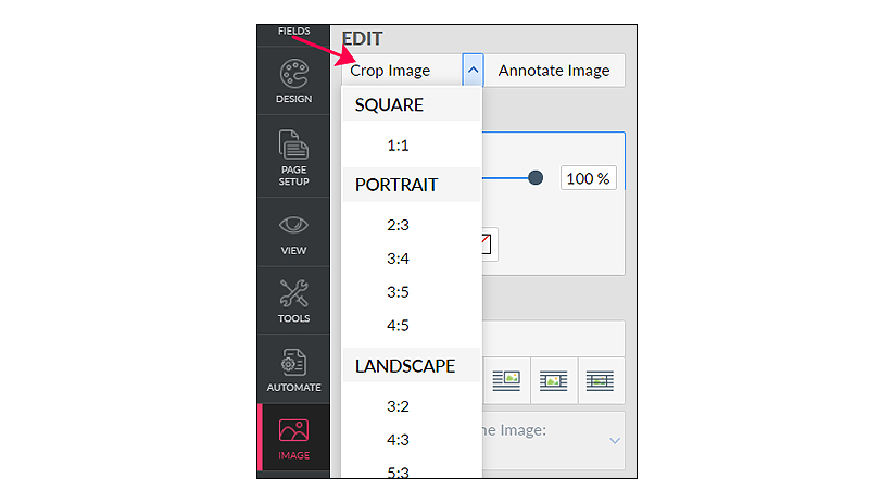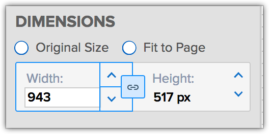 - 寸法ヘッダーで、画像の元のサイズを維持するか、ページ寸法に合わせるかを選択できます。また、必要に応じて選択した画像の高さや幅をカスタマイズできます。