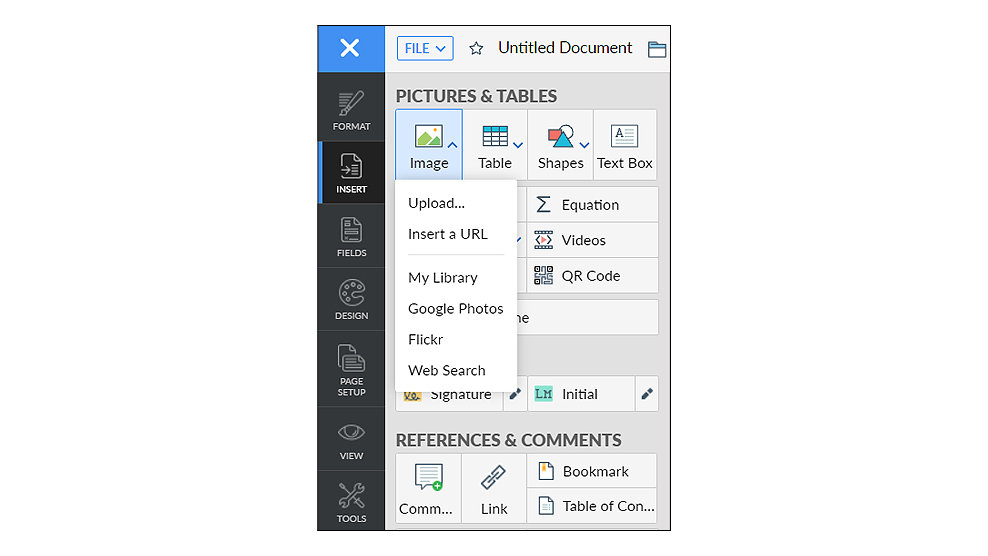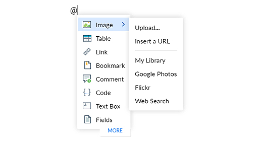 ドロップダウンリストから設定を選択し、必要な画像をドキュメントに挿入してください。画像はデスクトップ、画像ライブラリ、Web URL、Google フォト、Flickr、またはWeb検索から直接挿入できます。