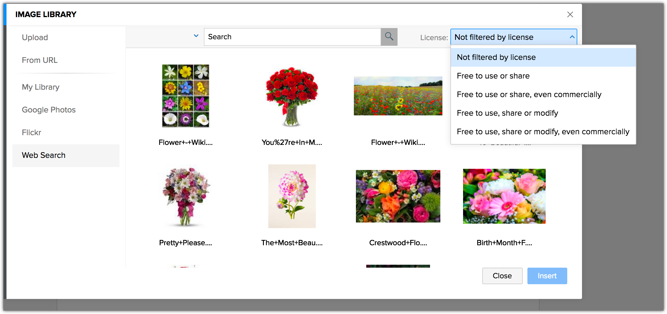 - 左側のパネルでウェブ検索をクリックすると、ウェブ検索タブが表示されます。検索タブを使って画像を検索します。また、ライセンス条件に応じて画像をフィルターし、必要な画像を選択してください。
