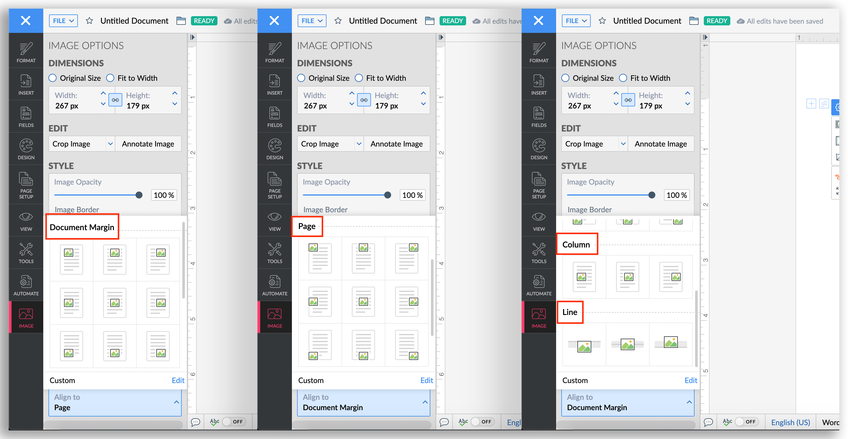 プリセットを使うと、ワンクリックで画像をドキュメントの中央や、余白・ページ・列・折れ線グラフに対して上部・下部・左・右に揃えることができます。
