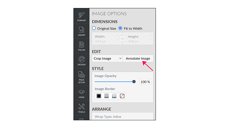 アイコンをクリックするか、画像設定パネルの編集ヘッダー内で画像に注釈をクリックします。