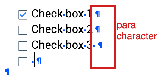ドキュメント内のチェックリストを拡大するには、リスト内容と追加の段落記号(各段落の末尾にある空白文字)をハイライトしてから、フォントサイズを増加させます。これによりチェックリストのサイズが拡大されます。