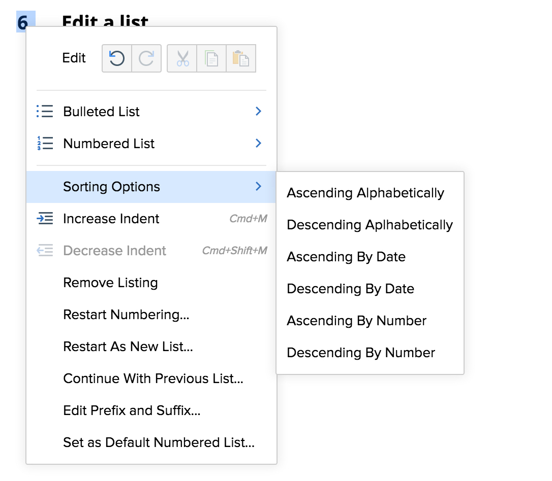 ドキュメント内のリストを右クリックすると、List 並べ替える Optionを見つけることができます。以下のスクリーンショットを参考にしてください: