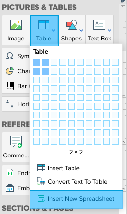この方法の興味深い点は、スプレッドシートを挿入するだけでなく、完全なスプレッドシートメニューを文書内にロードすることもできることです。これにより、スプレッドシート内で操作しているかのように、数式やその他の要素を挿入できます。